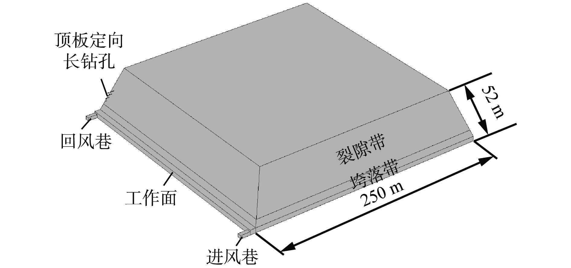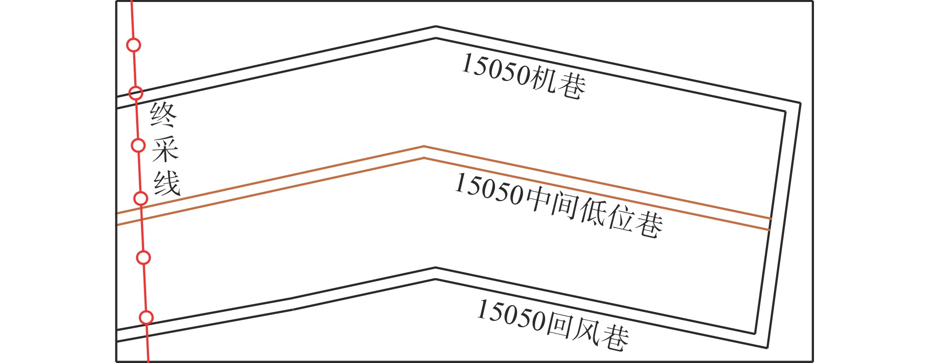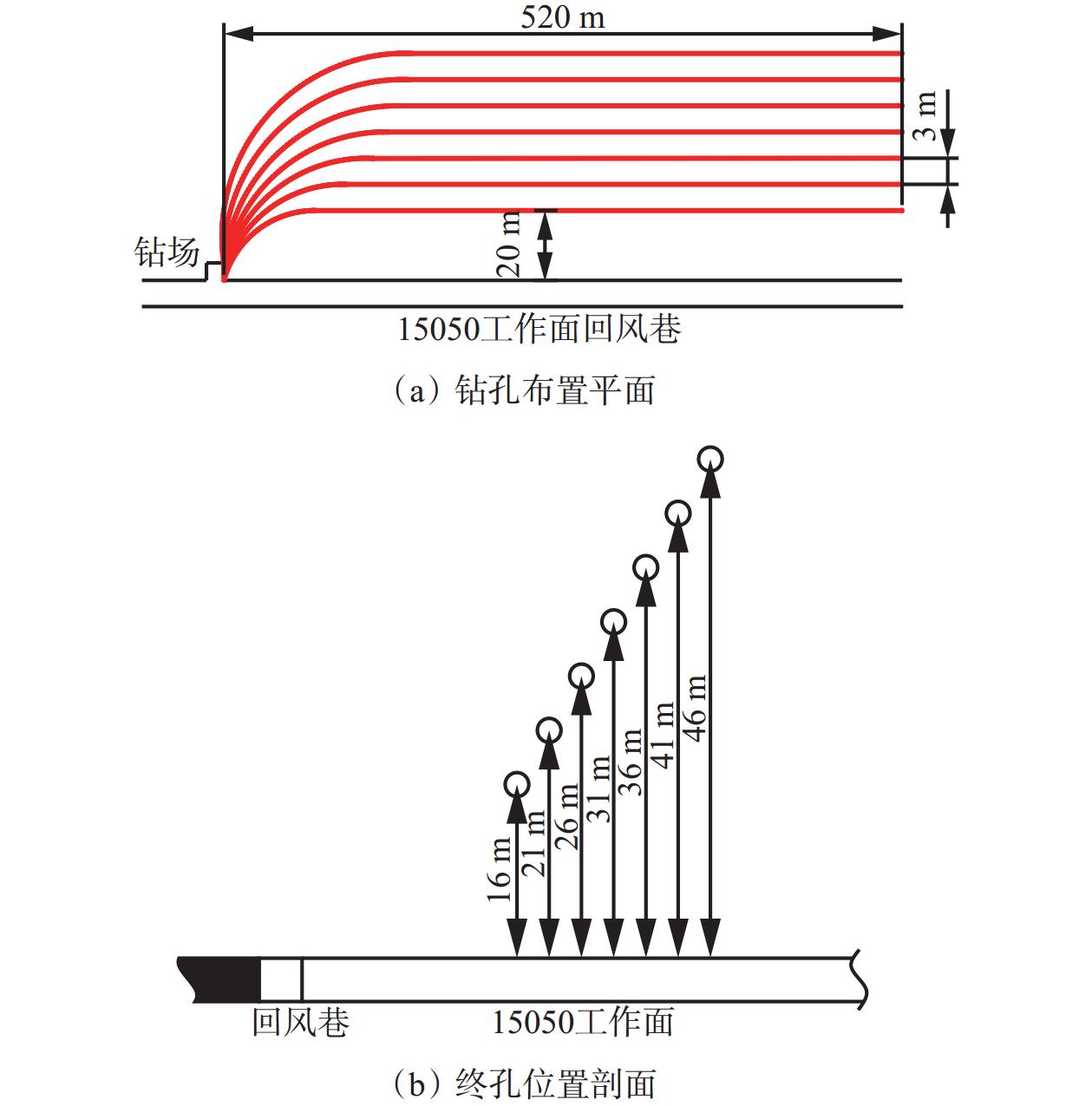 • 摘要: 目前针对以孔代巷瓦斯抽采技术中钻孔布置参数的研究大多只利用“三带”分布确定钻孔高度,但是对钻孔布置参数中的水平位置和间距的研究较少。针对该问题,以平煤股份15050工作面为工程背景,采用相似物理模拟实验、理论分析和数值模拟相结合的方法确定了大采长工作面顶板定向长钻孔布置参数。设计了15050工作面走向及倾向物理相似模拟实验,分析了大采长工作面走向和倾向覆岩垮落特征,得到覆岩垮落带高度为11.5 m、裂隙带高度为11.5~52.0 m,并确定了工作面采空区瓦斯富集区域,即回风巷附近和工作面附近的裂隙带内,为确定定向长钻孔施工位置指明了方向。为了准确计算对应钻孔的水平位置,依据倾向物理相似模拟研究结果建立了定向长钻孔水平位置计算模型,得到钻孔水平位置计算公式。为了确定钻孔的合理间距,建立了顶板定向长钻孔瓦斯抽采模型,分别模拟无长钻孔抽采和不同钻孔间距抽采时的瓦斯流向及浓度分布状态,确定了合理的钻孔间距为竖直方向5 m、水平方向3 m。现场应用结果表明,平均瓦斯抽采体积分数为16.1%,平均抽采纯量为4.1 m3/min,上隅角平均瓦斯体积分数为0.43%,实现了以孔代巷治理工作面瓦斯的预期效果。