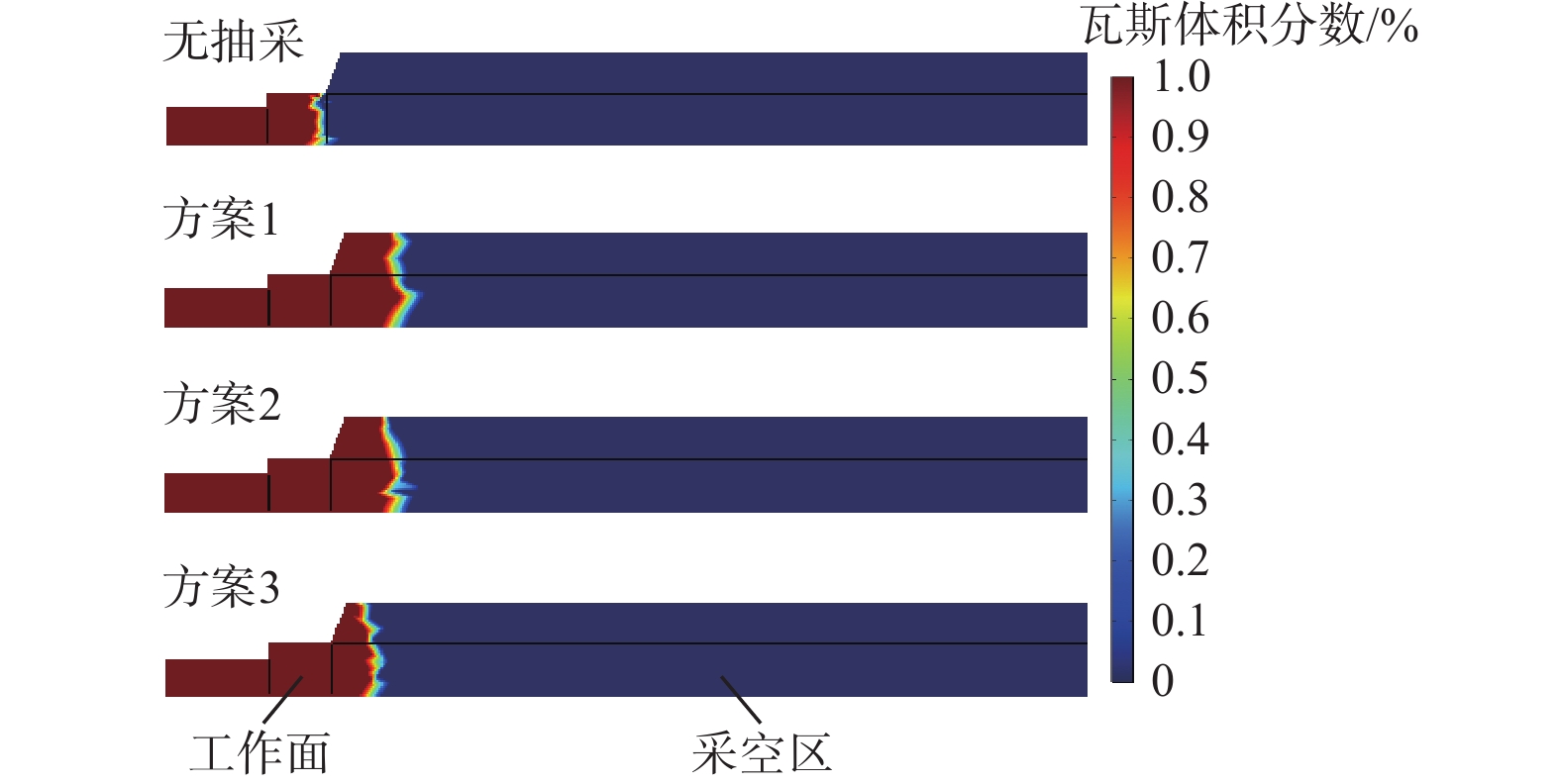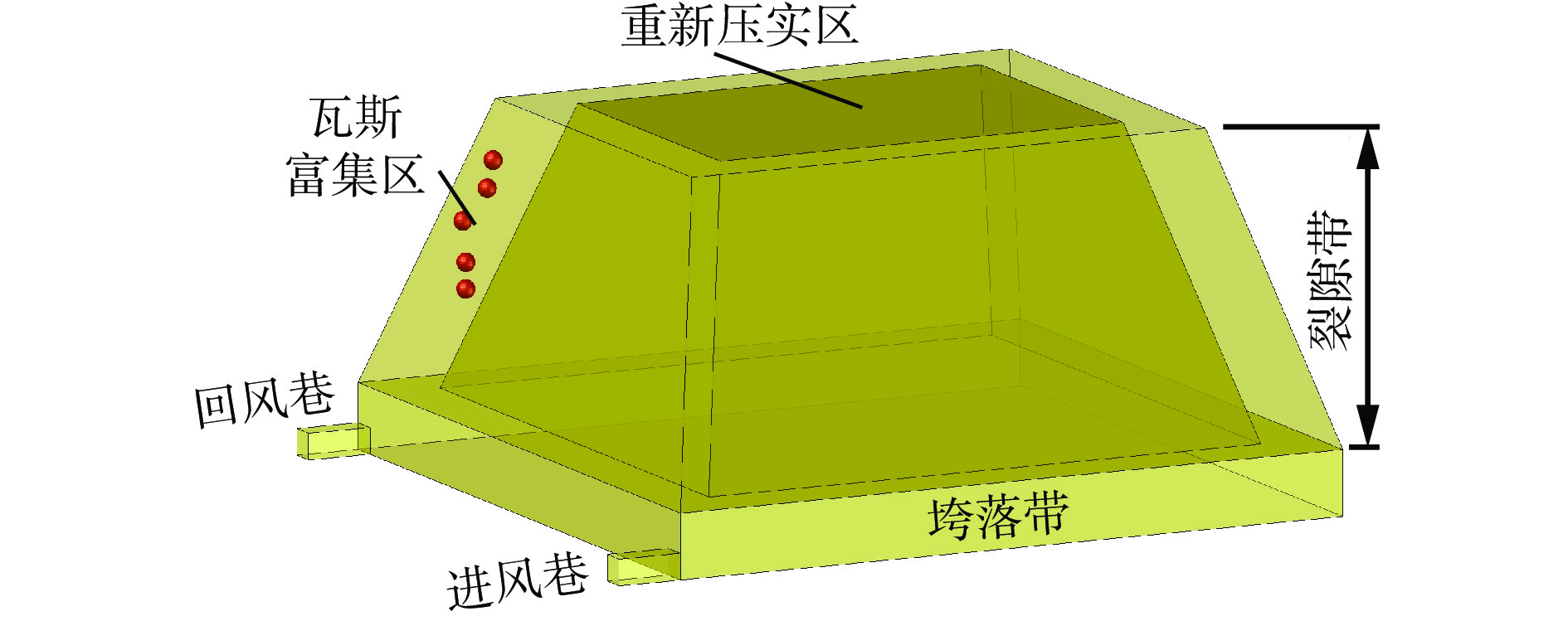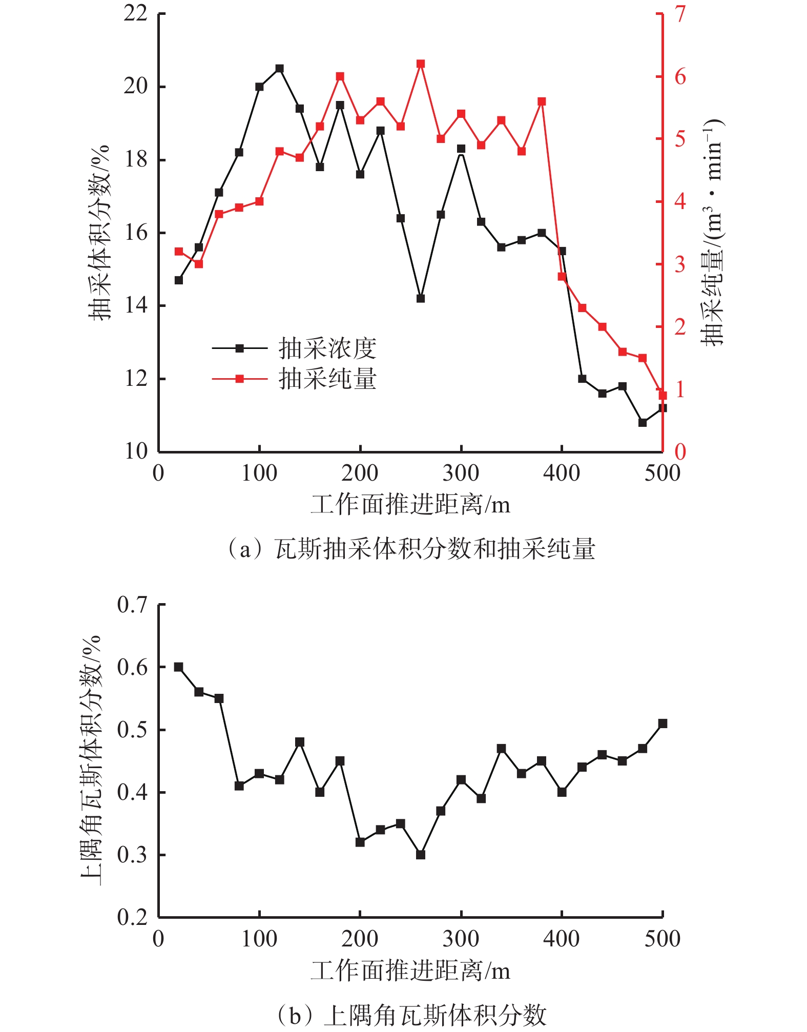 • 摘要: 目前针对以孔代巷瓦斯抽采技术中钻孔布置参数的研究大多只利用“三带”分布确定钻孔高度,但是对钻孔布置参数中的水平位置和间距的研究较少。针对该问题,以平煤股份15050工作面为工程背景,采用相似物理模拟实验、理论分析和数值模拟相结合的方法确定了大采长工作面顶板定向长钻孔布置参数。设计了15050工作面走向及倾向物理相似模拟实验,分析了大采长工作面走向和倾向覆岩垮落特征,得到覆岩垮落带高度为11.5 m、裂隙带高度为11.5~52.0 m,并确定了工作面采空区瓦斯富集区域,即回风巷附近和工作面附近的裂隙带内,为确定定向长钻孔施工位置指明了方向。为了准确计算对应钻孔的水平位置,依据倾向物理相似模拟研究结果建立了定向长钻孔水平位置计算模型,得到钻孔水平位置计算公式。为了确定钻孔的合理间距,建立了顶板定向长钻孔瓦斯抽采模型,分别模拟无长钻孔抽采和不同钻孔间距抽采时的瓦斯流向及浓度分布状态,确定了合理的钻孔间距为竖直方向5 m、水平方向3 m。现场应用结果表明,平均瓦斯抽采体积分数为16.1%,平均抽采纯量为4.1 m3/min,上隅角平均瓦斯体积分数为0.43%,实现了以孔代巷治理工作面瓦斯的预期效果。