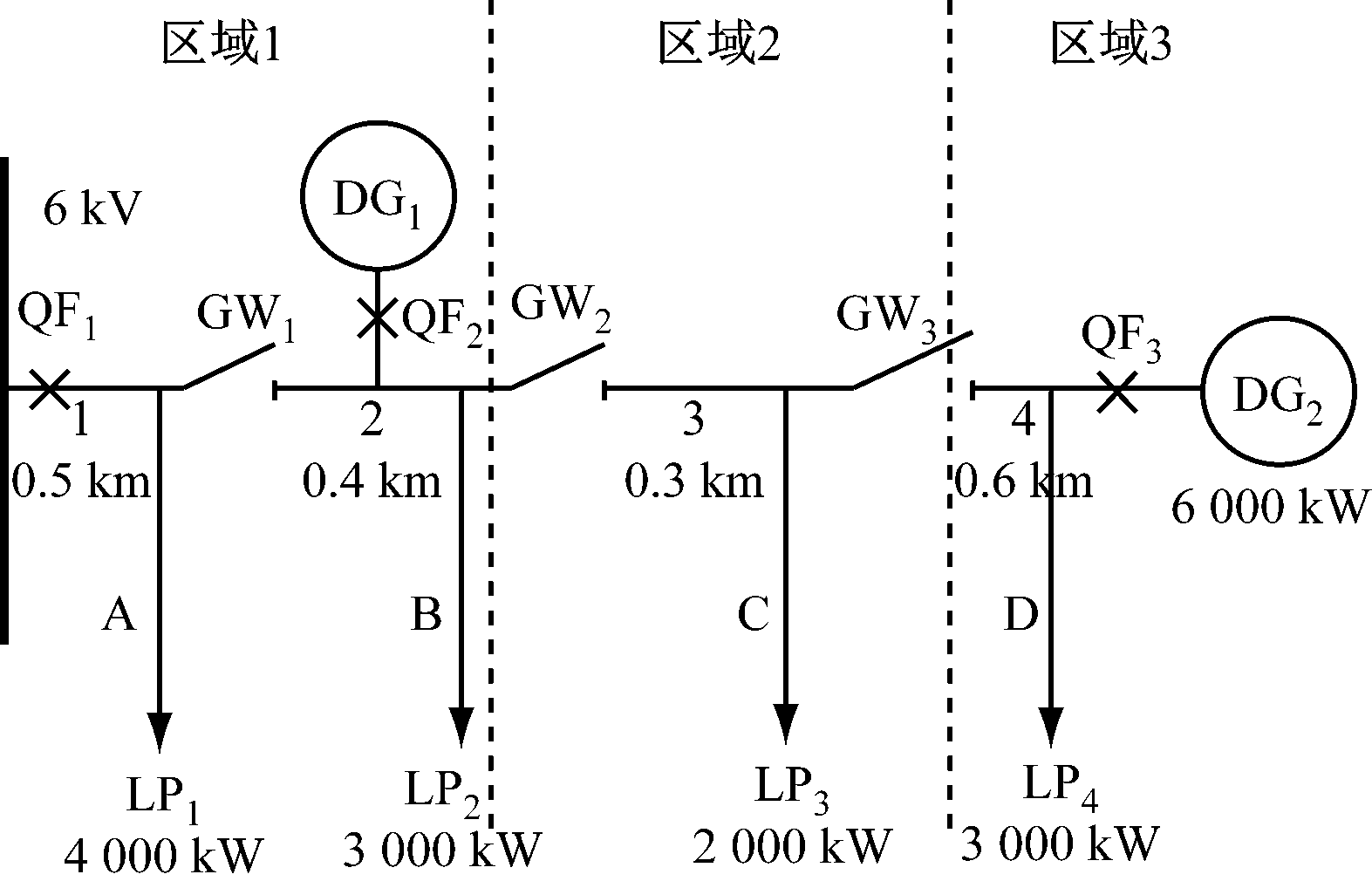 DG1和DG2并网可以避免上述事故。如图1所示,线路3段发生事故,整个系统被分为3个部分,6 kV母线和电源DG1向区域1中负荷LP1、LP2供电;区域2因故障被隔离,LP3停止用电;区域3中的负荷LP4仅由电源DG2供电,失去和大电网联系,形成孤岛。