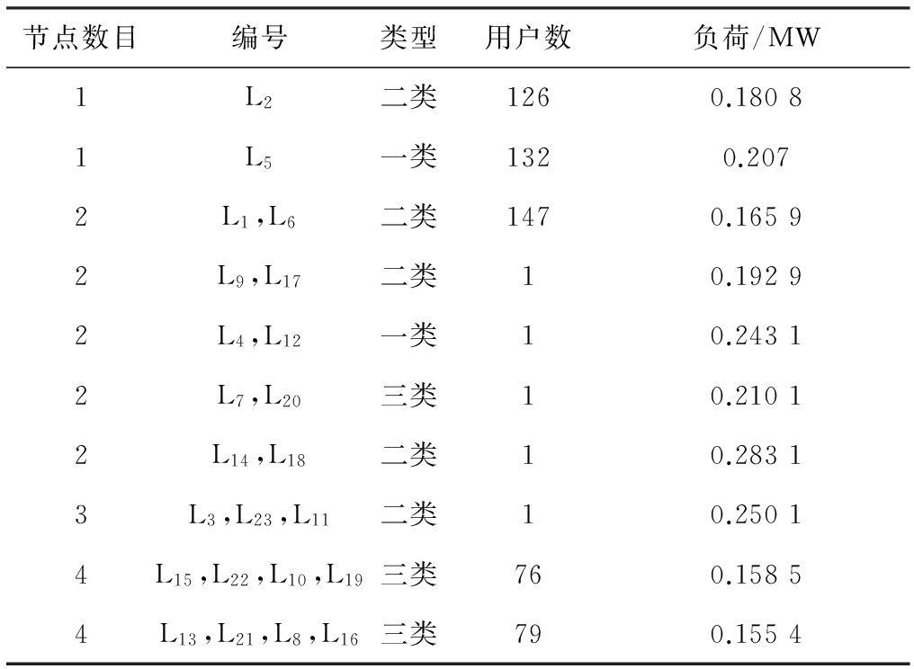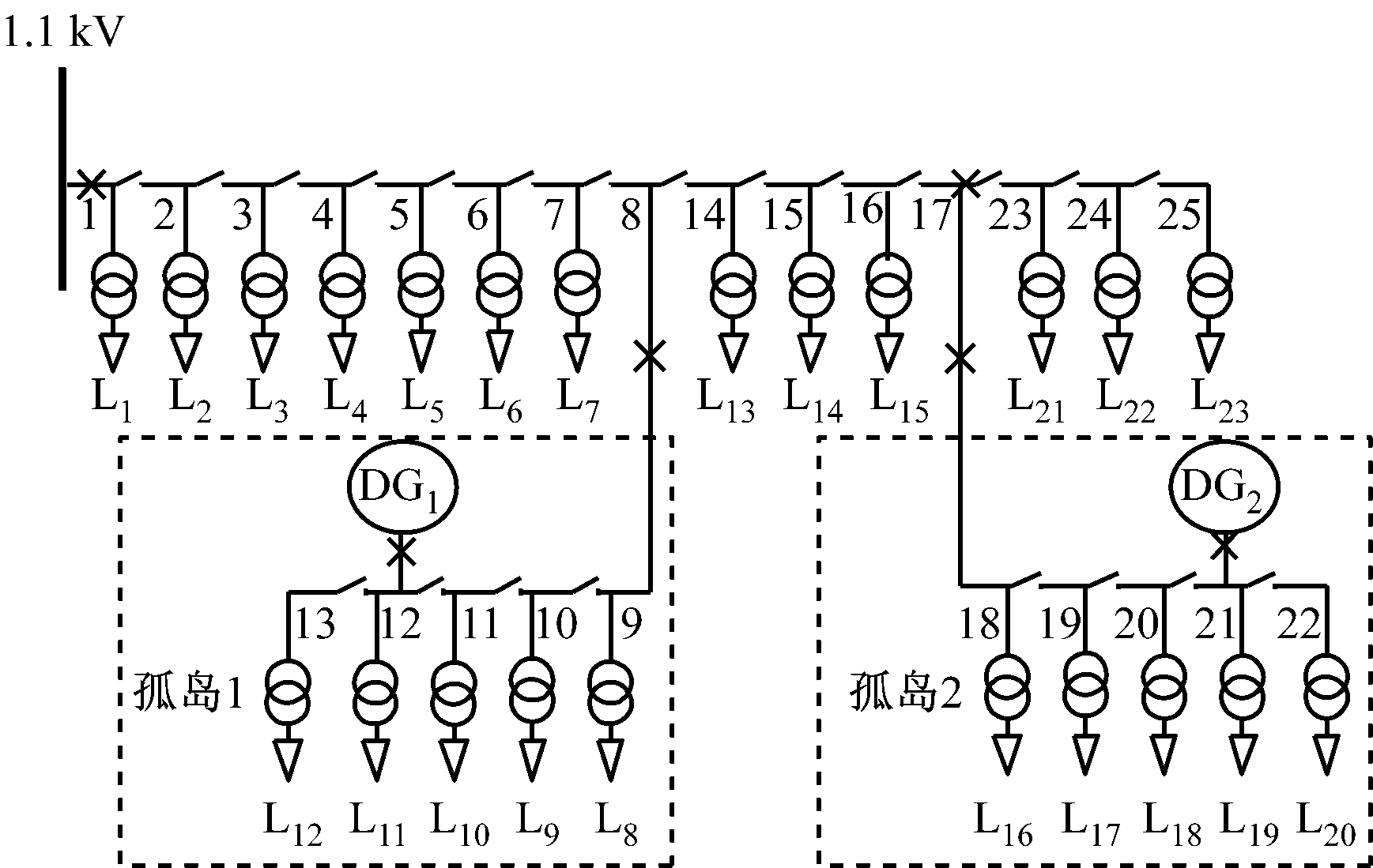 图5为以IEEE-RBTS Bus6系统主馈线F4为基础模拟的1条1.1 kV等级煤矿地面配电系统[12],DG1、DG2为分布式电源,L1—L23为负荷节点,这23条负荷分支都装有熔断器和变压器。图中负荷数据明细见表1。