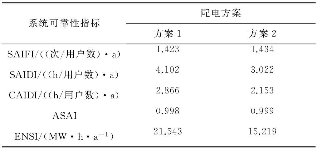 提出2种配电方案。方案1:不考虑分布式电源DG1、DG2影响;方案2:考虑分布式电源影响,DG1、DG2输出功率均为1 MW。运用BFS-最小路法并结合式(1)—式(10),在Visual C++ 6.0编译环境下对配电系统可靠性进行评估,评估结果见表2。
