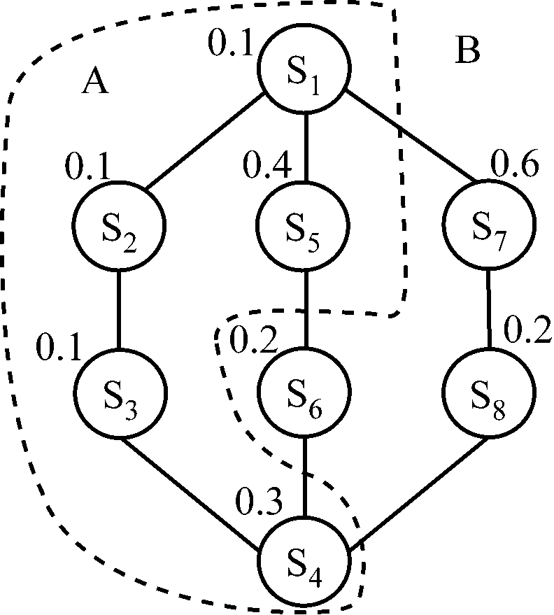 BFS方法首先要解决顶点的搜索问题,即将所有具有电气联系的节点依照连通关系归总到一个系统图中,如将分段母线的几个母线段当做一个节点计算等[8]。图化简完毕之后,从某一个顶点进行遍历,将顶点放入已访问列表,横向搜索所有还没有访问过的节点,标记已访问节点并放入已访问队列之中,按照此方法继续搜索直到没有剩余可访问节点[9],最后写出网络关联矩阵,计算所有路集,提高最小路集求取速度。BFS方法的优点是从近到远,逐层有序,不重复访问节点,节省了时间,提高了效率。