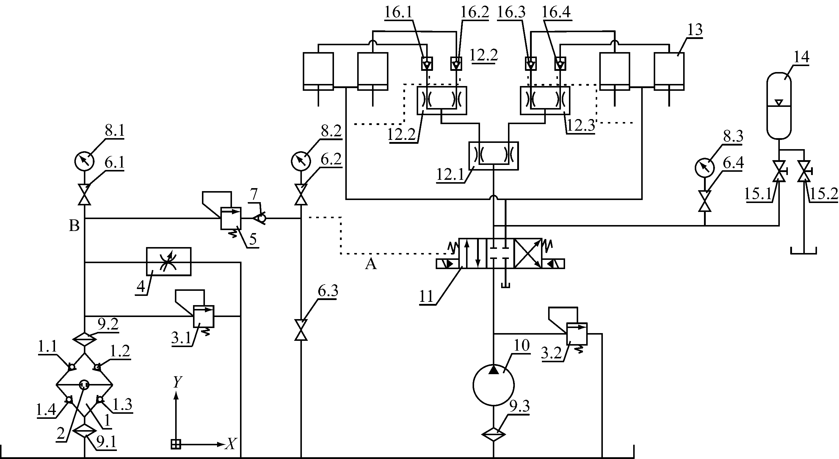10-液压泵; 11-三位四通换向阀; 12-分流集流阀; 13-液压缸; 14-蓄能器; 15-闸阀; 16-液控单向阀