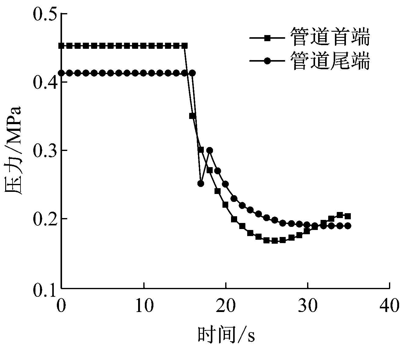 系统采用无相移滤波降噪方法处理泄漏发生时负压波下降沿拐点的幅值与相位信息,去除泄漏负压波高频噪声信号影响,保留负压波有效低频信号,获取清晰、稳定的负压波下降沿信息[11];同时根据泄漏点上下游光纤压力传感器捕捉的负压波信号幅值衰减规律,确定泄漏诊断过程中上下游光纤压力传感器负压波拐点评判标准,精确定位有效信号特征点。系统实际运行中,对管道两端光纤压力传感器监测的负压波信号进行滤波降噪处理后的结果如图4所示。