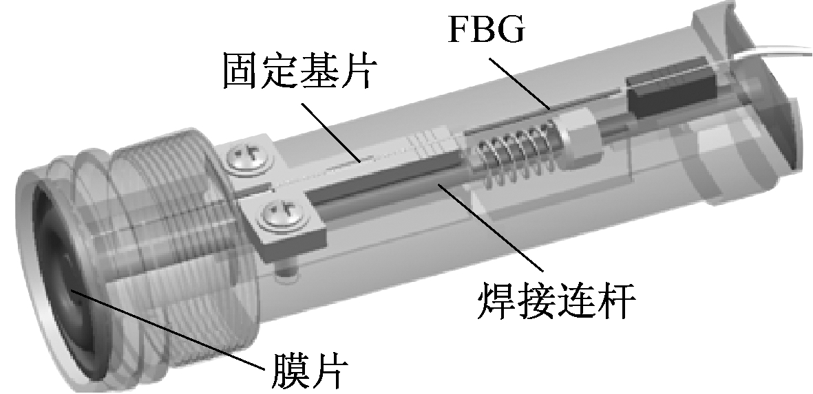 光纤压力传感器结构如图3所示。光纤光栅(FBG)的一端粘贴在螺丝固定的基片上,另一端粘贴在与连杆焊接在一起的粘贴平台上。当外界压力发生变化时,在膜片左右形成压差,膜片会发生位移,同时带动连杆动作,导致FBG拉伸或收缩,光栅中心波长λB发生偏移,通过检测λB的变化即可得到压力值。