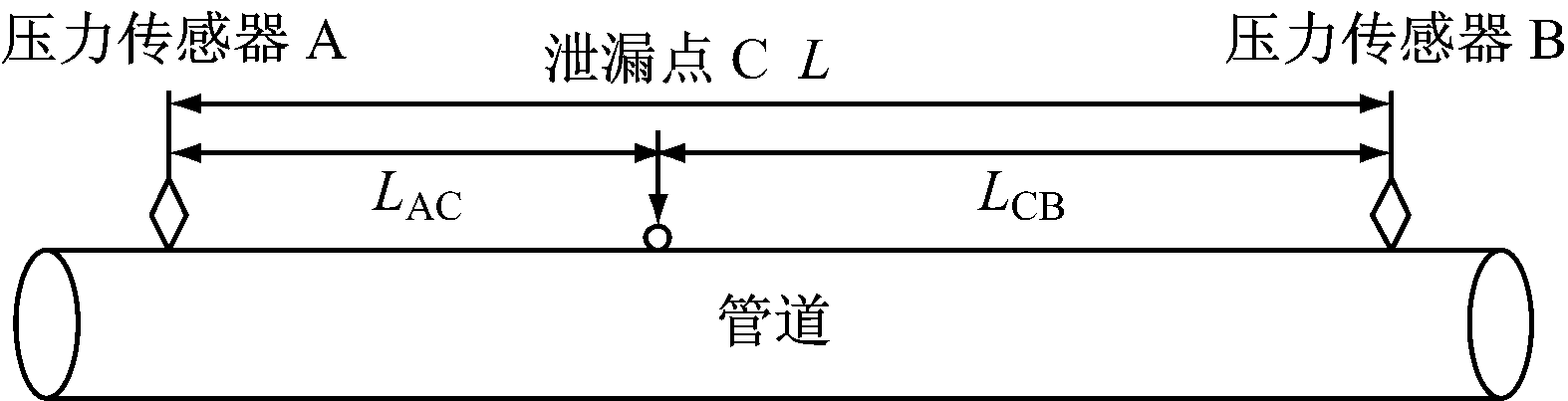 设光纤压力传感器A,B之间的管道长度为L,泄漏点为C,泄漏点C产生的负压波信号传到光纤压力传感器A的时间为tA,传到光纤压力传感器B的时间为tB,则负压波信号全程传播时间为