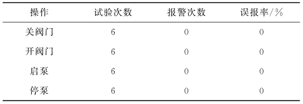 在管道正常工况下,分别对管道系统进行停启泵、开关阀门操作,每次停泵时间为3~4 min,以检验系统对管道正常工况变化的有效识别能力,试验结果见表1。可看出系统能够有效识别管道运输过程中停启泵、开关阀门等正常操作,实验过程中未出现泄漏误报等异常情况。