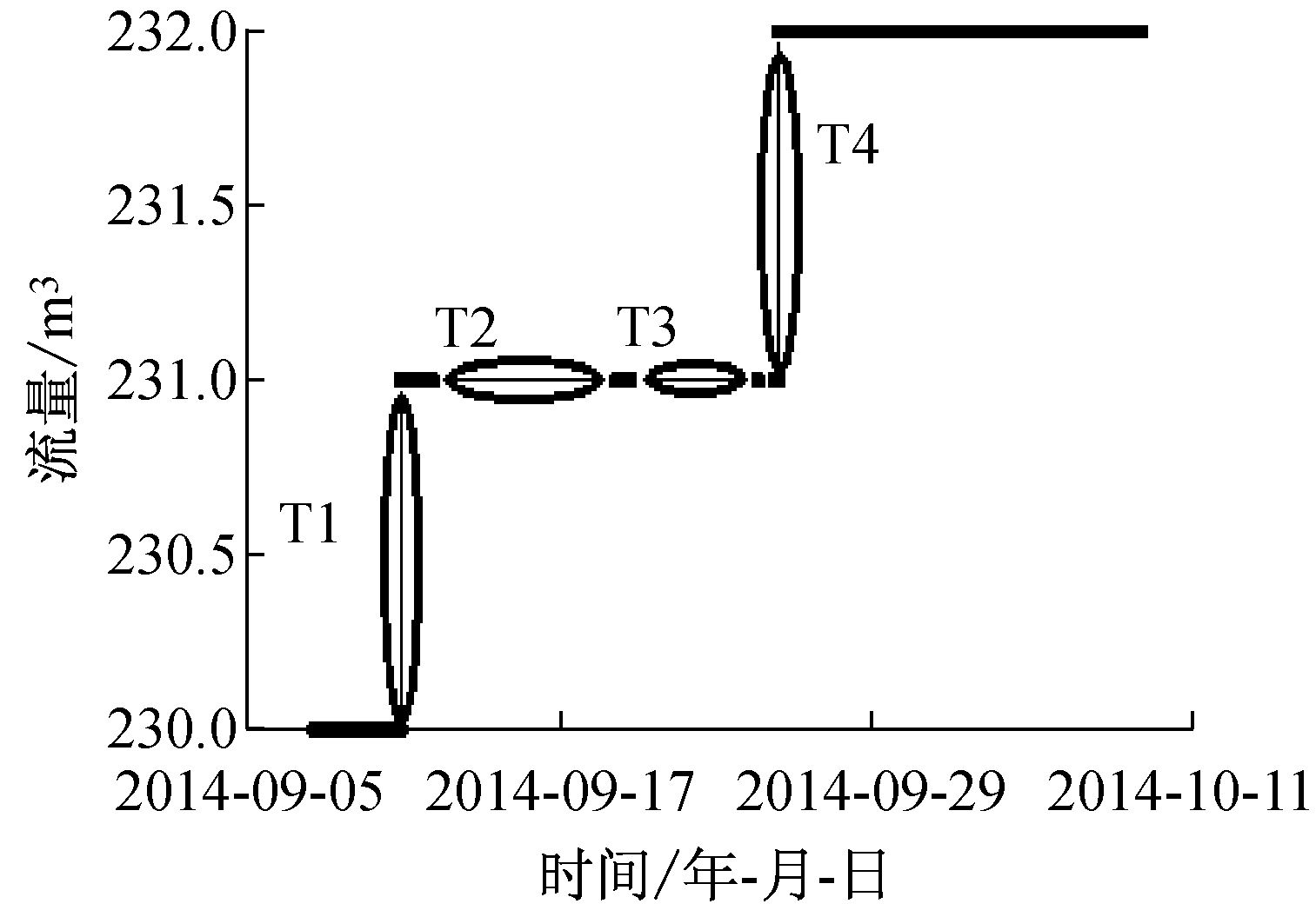 图6为供水管道累计流量长期监测数据,管道基准累计流量为230 m3。T2时间段因系统关闭,系统数据库没有监测数据;在T3时间段,系统工控机电源损坏,系统停止工作,数据库没有监测数据;在T1,T4时间段,供水管道水泵开启,供水管道内有水流通过光纤流量传感器,使得供水管道累计流量呈阶梯状上升。