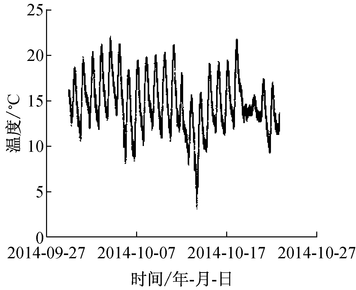 图5为瓦斯抽放管道远端直管温度长期监测数据,可看出管道内温度在15 ℃左右波动,波动范围约为10 ℃,每次波动最高温度在每天中午时间段,最低温度在每天早晨时间段,与日间正常温度变化相符。
