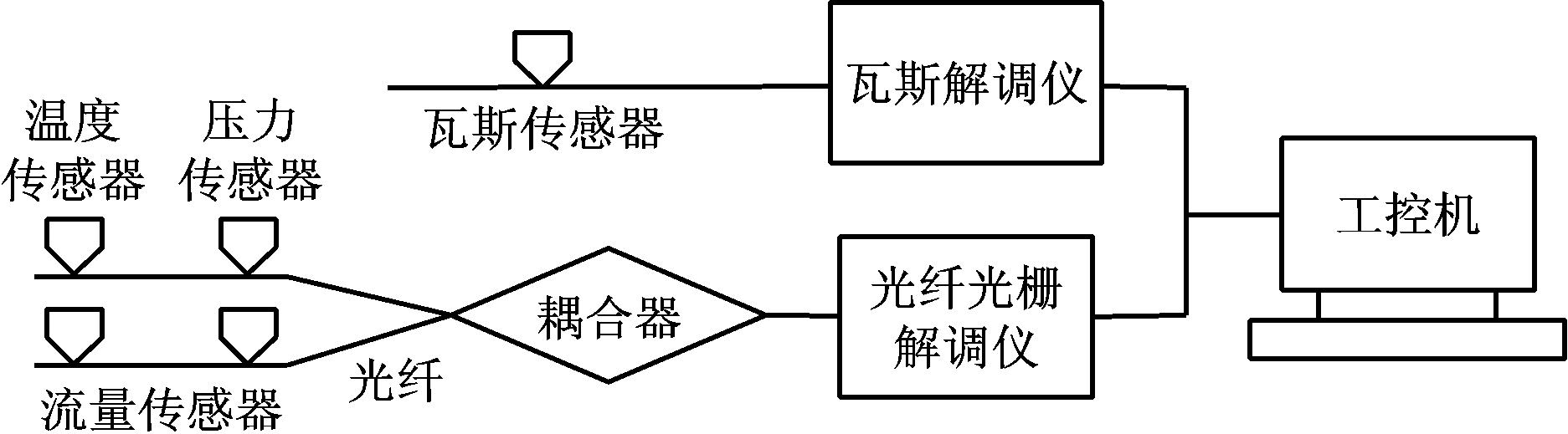 煤矿管道泄漏监测系统由1台工控机和若干远端传感器采集终端组成,具体包括光纤温度传感器、光纤压力传感器、光纤激光瓦斯传感器、光纤流量传感器、单模光纤、耦合器、多芯光缆、光纤光栅解调仪、光纤瓦斯解调仪、工控机等,如图2所示。光纤温度传感器、光纤压力传感器、光纤流量传感器通过单模光纤连接耦合器,耦合器通过多芯光缆连接光纤光栅解调仪。光纤激光瓦斯传感器通过多芯光缆直接连接瓦斯解调仪,光纤光栅解调仪、光纤瓦斯解调仪通过网口与RS485接口连接工控机。工控机对检测信号进行解析处理,实时监测管道内部温度、压力、瓦斯浓度、流量及负压波信号,通过对管道运行状态进行实时多参数综合分析,实现管道泄漏监测及管道运行状态综合评估。
