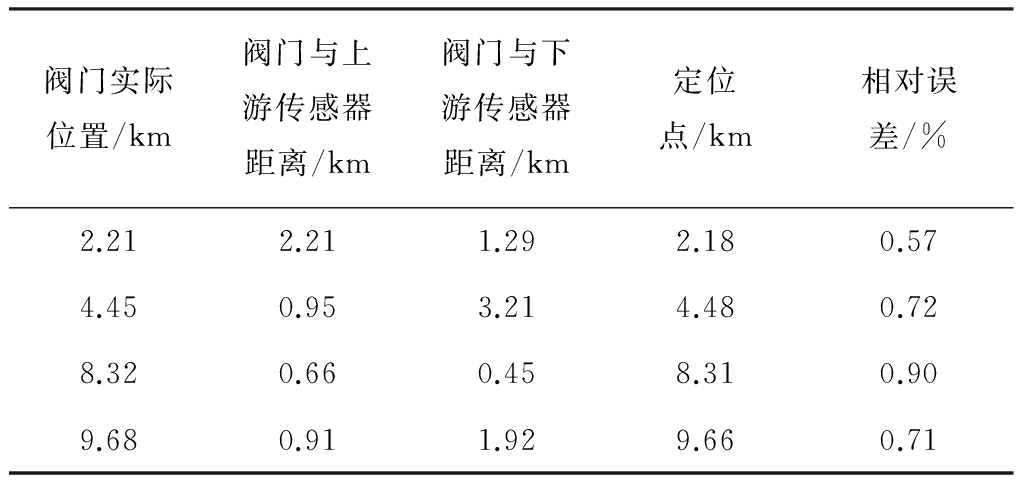 为了进一步测试系统监测管道泄漏的可靠性及泄漏点定位能力,通过开关安装在管道上的4个阀门模拟管道泄漏过程。试验结果见表2。可看出系统能对管道突发的泄漏事故进行有效判断,并能对泄漏点进行定位,定位误差小于1%,满足实际应用要求。另外,在4次试验中,系统均在管道发生泄漏后10 s内报警。