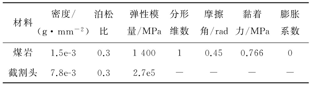 对于截割头的材料参数,综合考虑仿真时间及截割接触的力学行为,分析过程中将截割头整体作为一个刚性体,材料参数选取直接参与截割的合金刀头的参数,材料参数见表2。