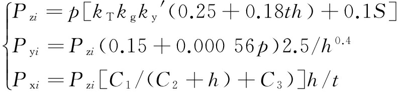 式中:Pzi,Pyi,Pxi分别为截割头上第i个截齿上的截割阻力、牵引阻力、侧向力;p为岩石的接触强度;kT为截齿类型系数;kg为截齿几何形状系数;ky′为刀杆头部形状系数;t为平均截线距;h为平均切削厚度;S为截齿后刃面在牵引方向的投影面积;C1,C2,C3为切屑影响系数。