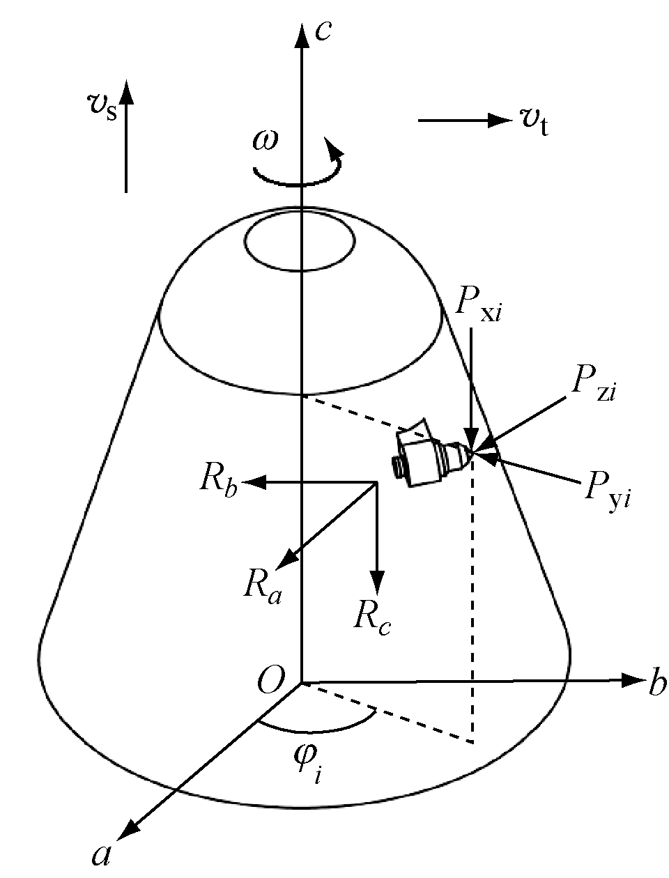由于实际截割头模型较复杂,为便于分析,建立以截割头的回转中心轴为c轴的坐标系,得到如图2所示的截割头受力示意。ω为截割头转速;vs,vt分别为截割头钻进和进给速度。