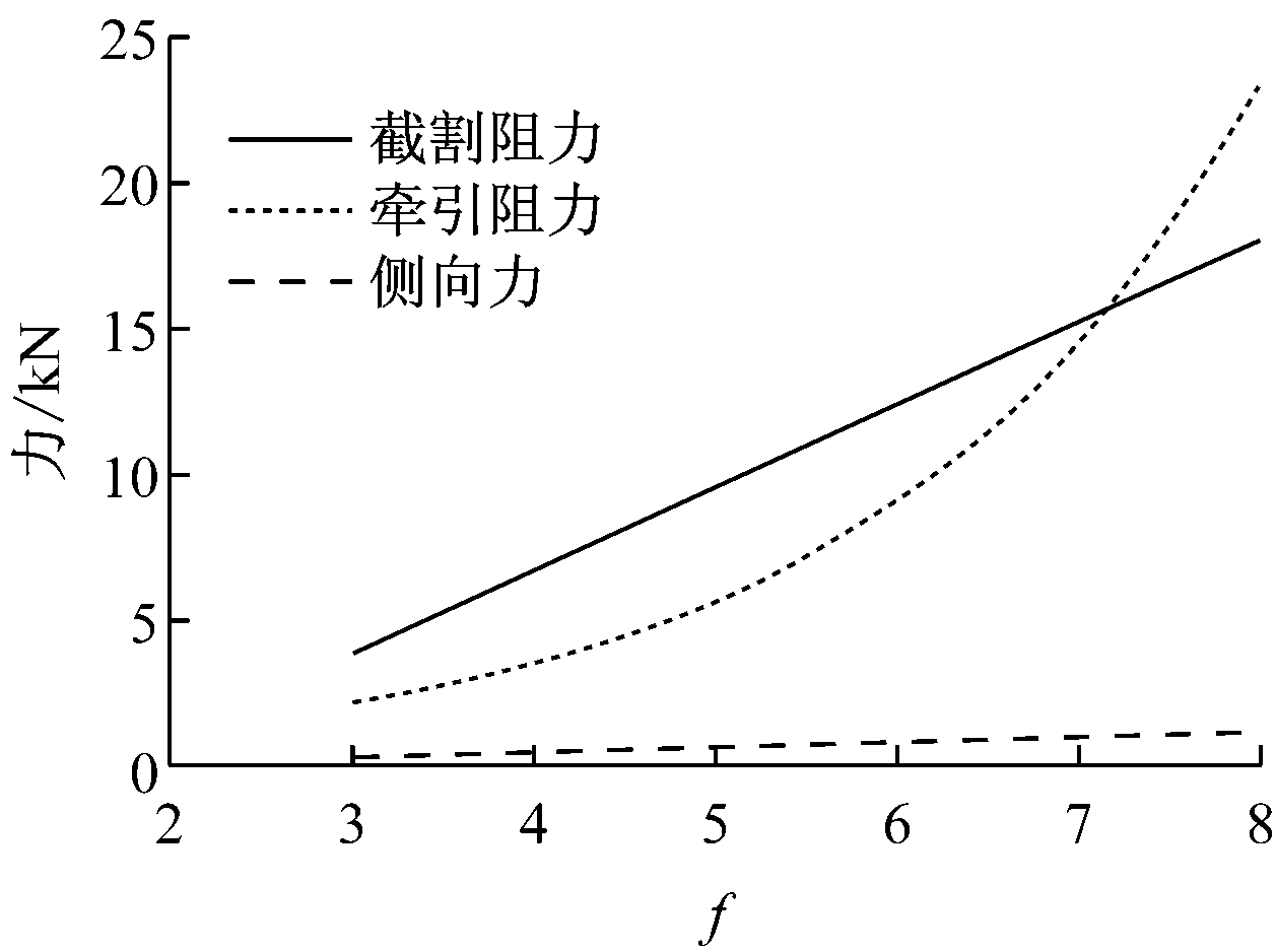 根据式(1)及表1,可绘制截齿所受的截割阻力、牵引阻力、侧向力与普氏系数f的关系曲线,如图1所示。可看出截齿的截割阻力、侧向力与普氏系数呈线性相关,随着煤岩普氏系数的增大,截割阻力和侧向力变大;截齿的牵引阻力随普氏系数的增大呈指数形式增长。