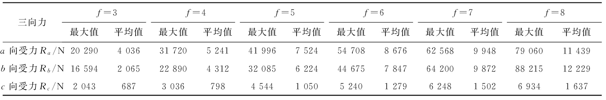 为了获取不同煤岩特性下截割头的三向力变化规律,统计普氏系数f=3-8时截割头受到的三向力最大值及平均值,得到不同普氏系数下截割头截割煤岩载荷统计值,见表4。可看出不同普氏系数下截割头受到的截割阻力和牵引阻力的最大值及平均值都比侧向力大很多;随着普氏系数的增加,三向力也呈现增大趋势。根据表4数据绘制截割头三向力最大值及平均值与普氏系数f的关系曲线,如图4、图5所示。