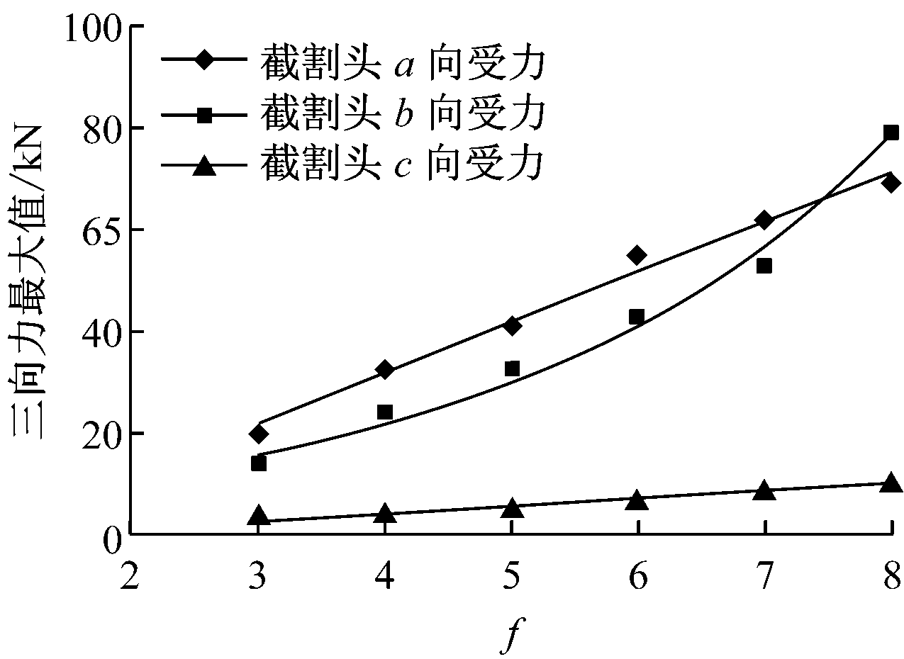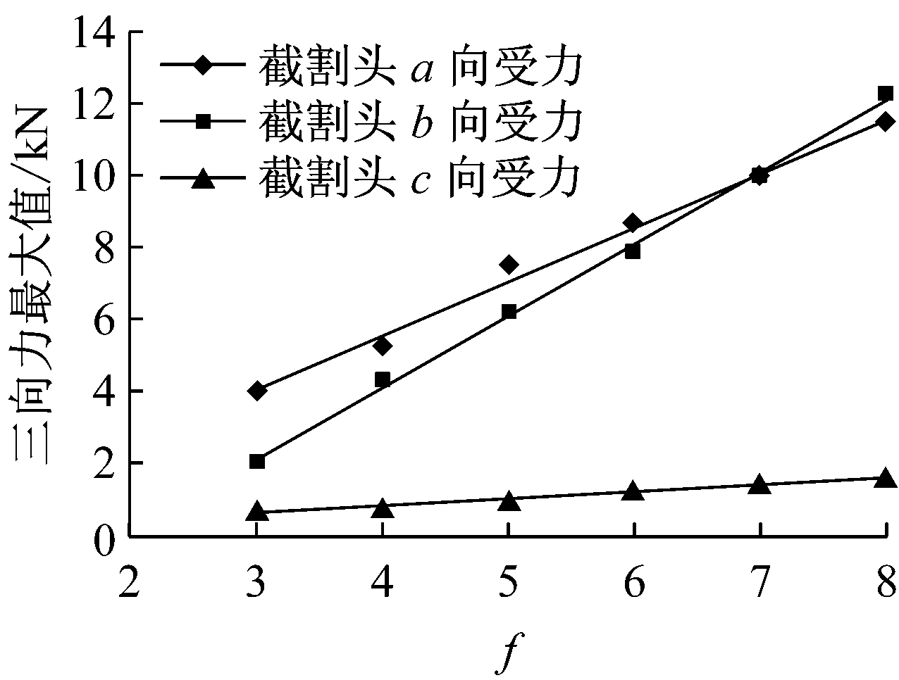 从图4、图5可看出,截割头三向力最大值的变化规律与理论上单个截齿受力的变化规律一致,但相关性不如单个截齿的变化规律明显;截割头三向力平均值随普氏系数的增大而线性增大。分析可知,随着煤岩坚固性的增强,截割难度增大,截割头的载荷显著增加,但三向力增加的速率不同,当煤岩的普氏系数增大到一定程度时,截割头的牵引阻力将成为截割头的最大载荷,而侧向力一直处于较低的水平。因此,在破碎较硬的岩石时,在保证截齿性能的前提下,应增大截割头的截割功率来保证截割效率。