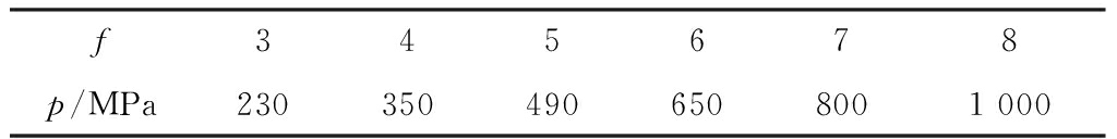 式(1)中除p外,其余参数值均可按照参考文献[1]选取。岩石的接触强度p与岩石的普氏系数f存在一定的对应关系,见表1。