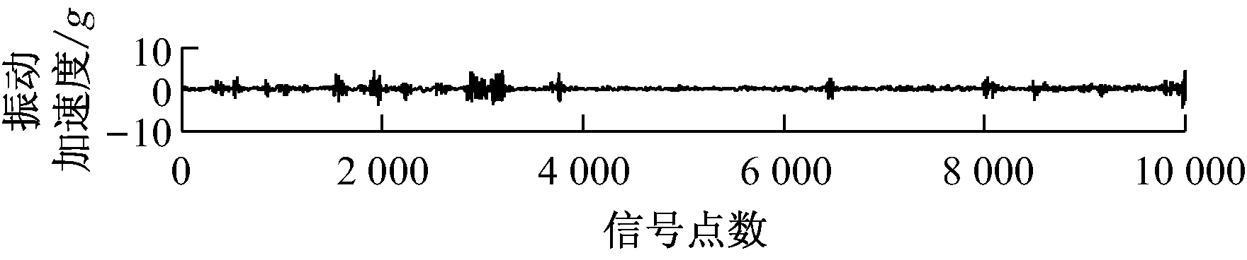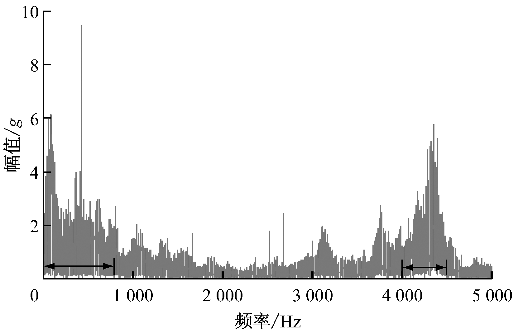 横轴式超重型岩巷掘进机截割头振动信号的特征敏感频段在低频和高频处都有分布。其中最低频率可以达到几十赫兹,而在高频部分可以达到4~5 kHz。试验中,掘进机截割头振动信号的采样频率为10 kHz。 根据采样定理,只有当采样频率大于信号中最高频率的2倍时,采样之后的信号才能完整地保留原始信号中的信息。因此,信号的最高频率不会超过5 kHz。以5 kHz为信号的最高频率,对信号进行频谱分析,得到频谱如图2所示,其中g为重力加速度。