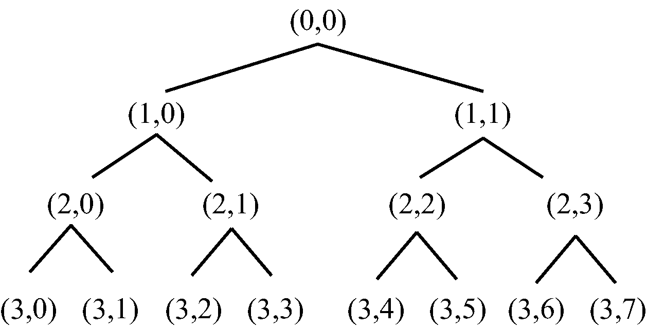 通过小波包树来理解小波包分解。以小波包3层分解为例,小波包分解树如图1所示。图中节点(0,0)代表原始信号。