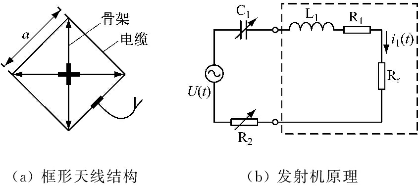 为了减轻系统体积和重量,采用一个框形天线来进行透地通信信号的发射和接收。框形天线由2个部分构成:矿用阻燃电缆和拆卸式碳纤维骨架。当需要进行通信时,将骨架组装成十字形结构,将阻燃电缆固定在骨架的顶端,如图3(a)所示,天线形状固定,电感基本不变,天线和收发系统的匹配变得简单。框形天线内部由N(N≥1)匝绝缘导线绕制而成,边长为a,周长l≪λc(λc为载波波长)。如图3(b)所示,U(t)为发射机末级功率放大器的输出电压,C1为发射电路调谐电容,R2用来调节发射电流;虚线框内为发射天线等效电路,L1为天线电感,R1为天线欧姆损耗电阻,Rr为天线辐射电阻。其中Rr代表发射电路辐射能力,一般有Rr≪R1。