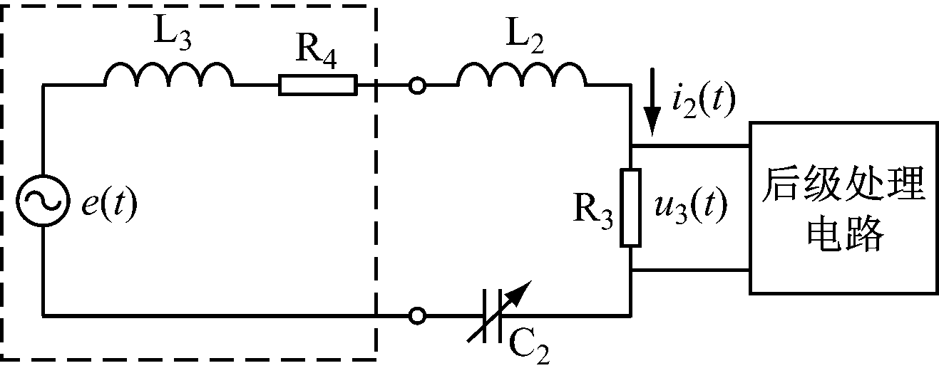 接收点的信号一般比较微弱,接收电路需要具备良好的选频特性,因此,要提高接收回路的品质因数Q值,在接收回路中串联一个高Q值的选频电感L2,以提高接收电路选择性。感应电动势e(t)在接收回路中产生感应电流i2(t),R3为一个阻值很小的采样电阻,用来将感应电流i2(t)转换为电压u3(t),便于后级电路进一步处理。