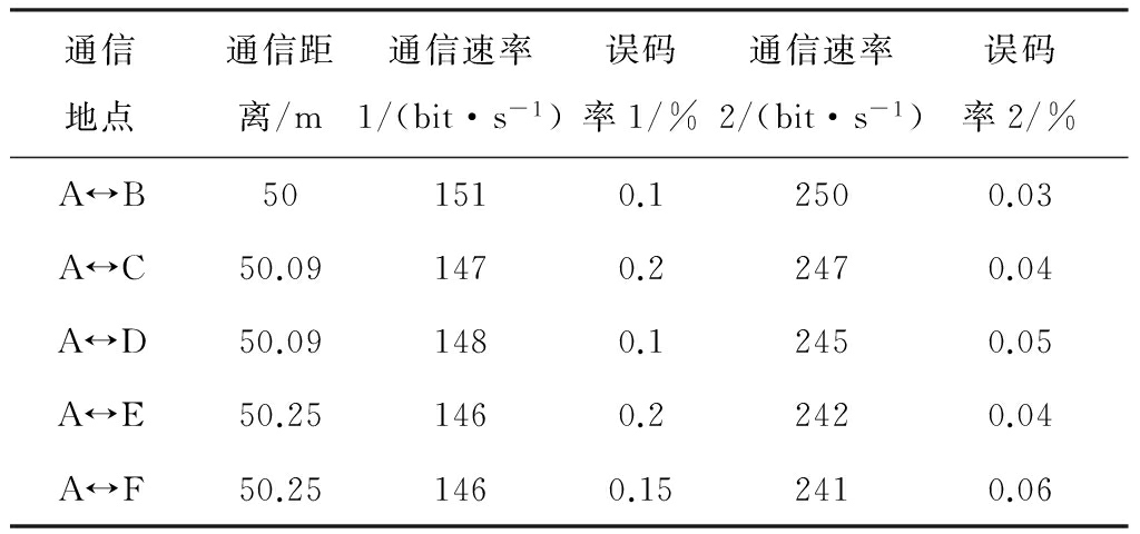 实验场地示意如图5所示,透地通信的电磁波穿透的地层以泥岩、砂岩和石灰岩为主。将一台设备布置在距离平硐矿井洞口200 m的井巷中间位置A,另一台设备在距离A点的垂直高度为50 m的地面山坡等高面上移动,B点位于A点的正上方,C点、D点和B点的距离均为3 m,E点、F点和B点的距离均为5 m,在B点、C点、D点、E点、F点分别进行5次实验,每次实验时间为10 min,对实验结果求平均值,获得的实验数据见表1。表1中,通信速率1和误码率1表示井下发射、地面接收时的通信指标,通信速率2和误码率2表示地面发射、井下接收时的通信指标。