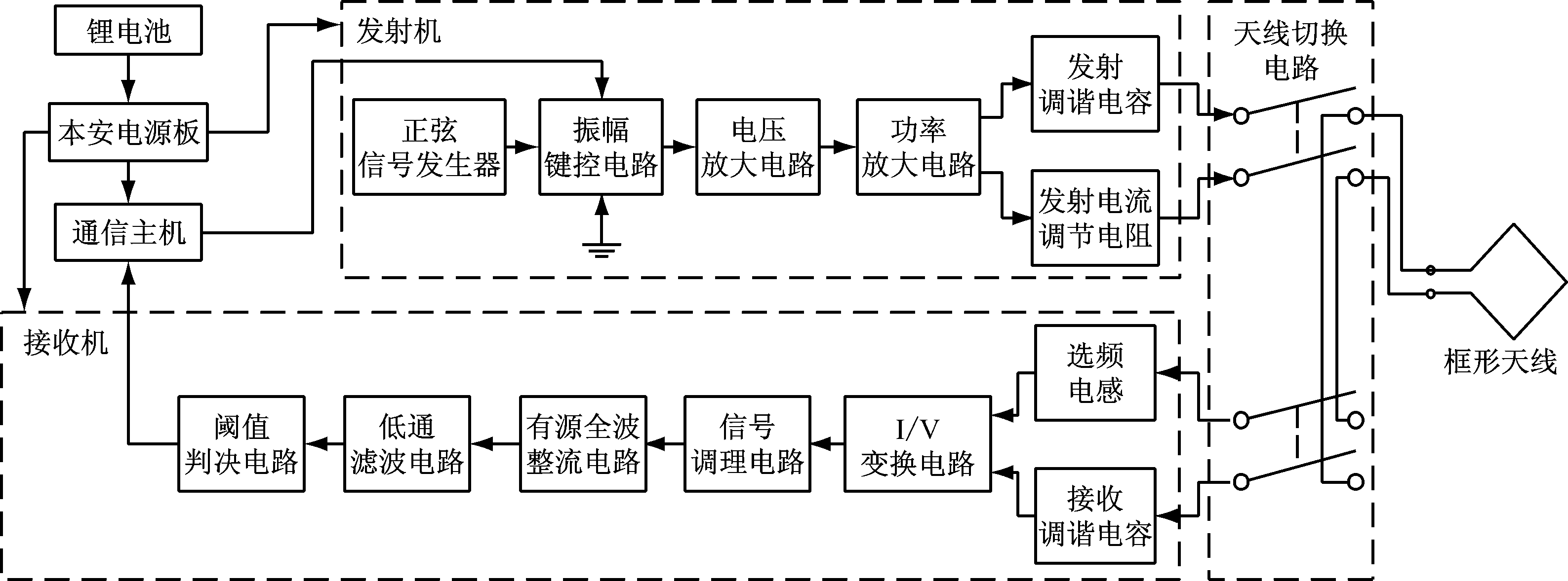 矿用本安型无线透地通信系统主要由锂电池、本安电源板、通信主机、发射机、接收机、框形天线和天线切换电路组成,如图1所示。锂电池和本安电源板为系统提供安全稳定的电源供应。通信主机负责控制发射机和接收机的工作。发射机主要由正弦信号发生器、振幅键控电路、电压放大电路、功率放大电路、发射调谐电容和发射电流调节电阻组成。接收机主要由选频电感、接收调谐电容、I/V变换电路、信号调理电路[5]、有源全波整流电路、低通滤波电路和阈值判决电路组成。由于发射机和接收机分时利用同一框形天线,采用天线切换电路来实现发射机或接收机的接通逻辑。
