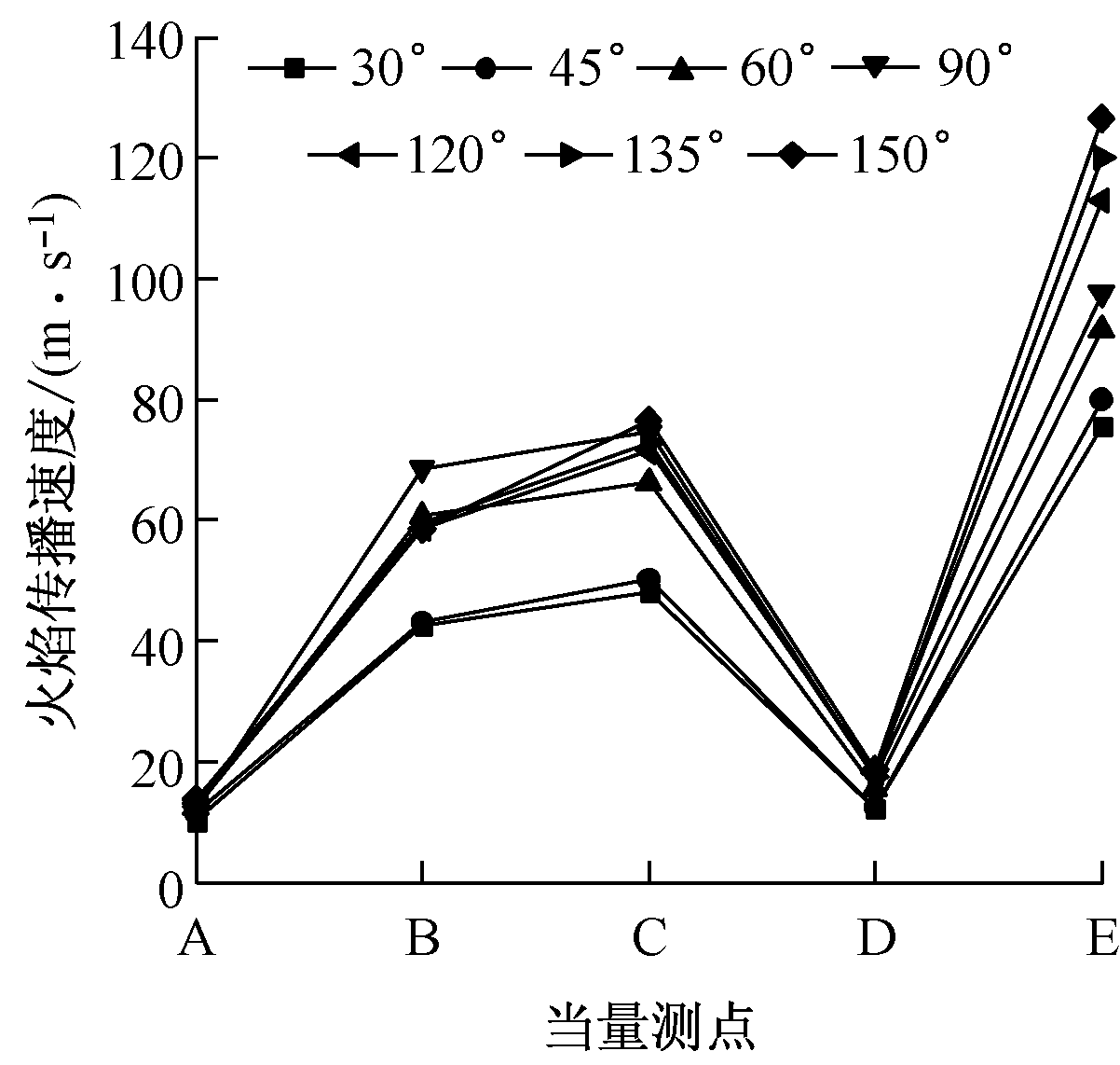 (2) 在水平管道中,火焰传播速度呈稳步增大趋势;在拐弯点处,火焰传播速度发生突变,迅速减小;经过拐弯点后,火焰传播速度迅速增大。