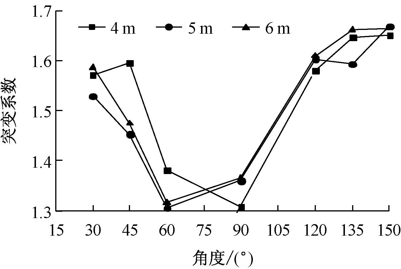 为减少实验误差,每组实验在相同工况下需进行3次,数据相对差异较小时才认为实验成功。同一拐弯角度下,充填4,5,6 m这3种不同长度的瓦斯气体,分别重复3次(共9次)成功爆炸实验,完成一种拐弯角度下的测试。拐弯管道共有7种角度,需进行63次成功实验。