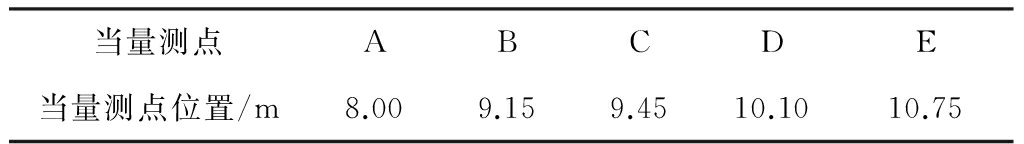 图2中测点1距起始点(起始传播位置,即爆炸源处)7.0 m,测点1与测点2间距2 m,测点2与测点3、测点3与测点4间距均为0.3 m,测点4距拐弯点0.4 m,测点5距拐弯点0.6 m,测点5与测点6间距0.3 m。将2个测点的中点位置设为当量测点,测点1—测点6的当量测点依次定义为A—E,则测点位置分布情况见表1。