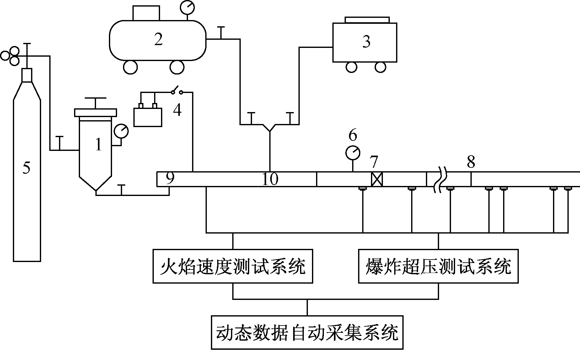 1-瓦斯仓;2-空气压缩机;3-真空泵;4-点火系统;5-高压储气瓶;6-真空表;7-阀门;8-瓦斯爆炸传播管道系统;9-瓦斯喷嘴;10-瓦斯填充区