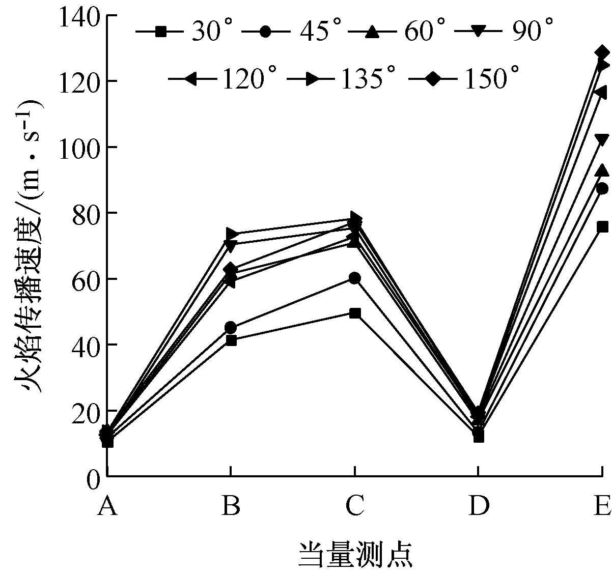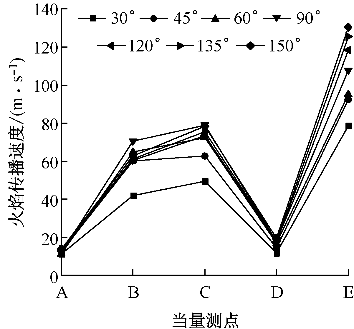 (1) 当管道拐弯角度为30°,瓦斯填充长度分别为4,5,6 m时,当量测点A处的火焰传播速度分别为10.23,10.57,11.17 m/s,火焰传播速度随瓦斯充填长度的增大而增大。其他瓦斯充填长度、管道拐弯角度的管道,各当量测点处的瓦斯传播速度具有类似规律。可见管道拐弯角度一定时,若瓦斯填充长度不同,则火焰传播速度不同,且瓦斯填充长度越长,管道内瓦斯爆炸火焰传播速度越大。
