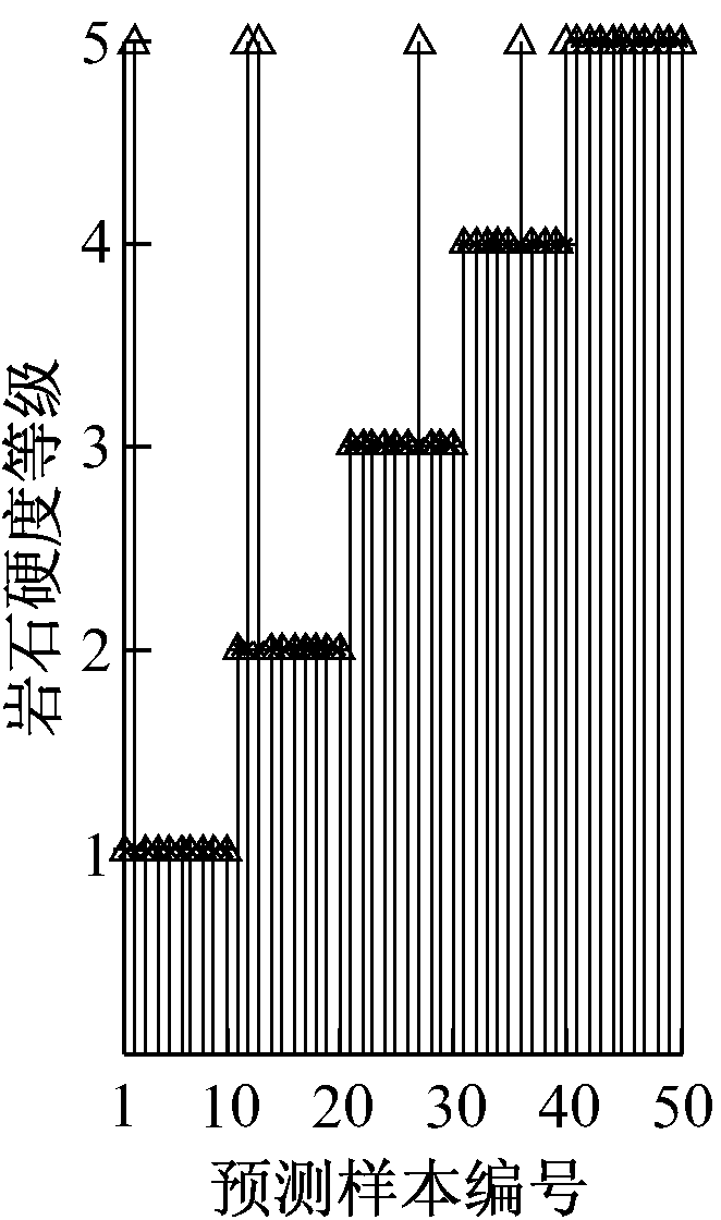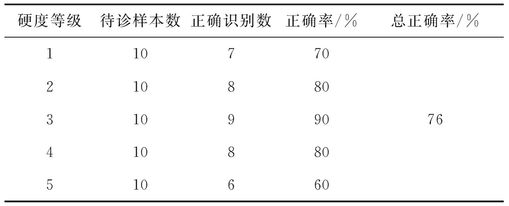 将经过预处理的100组(每级硬度对应20组)振动、电流和压力数据作为RBF神经网络的训练样本数据,其余50组数据输入到训练好的RBF神经网络中,用于检验RBF神经网络对岩石硬度的分类识别能力。