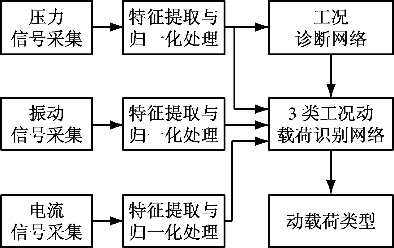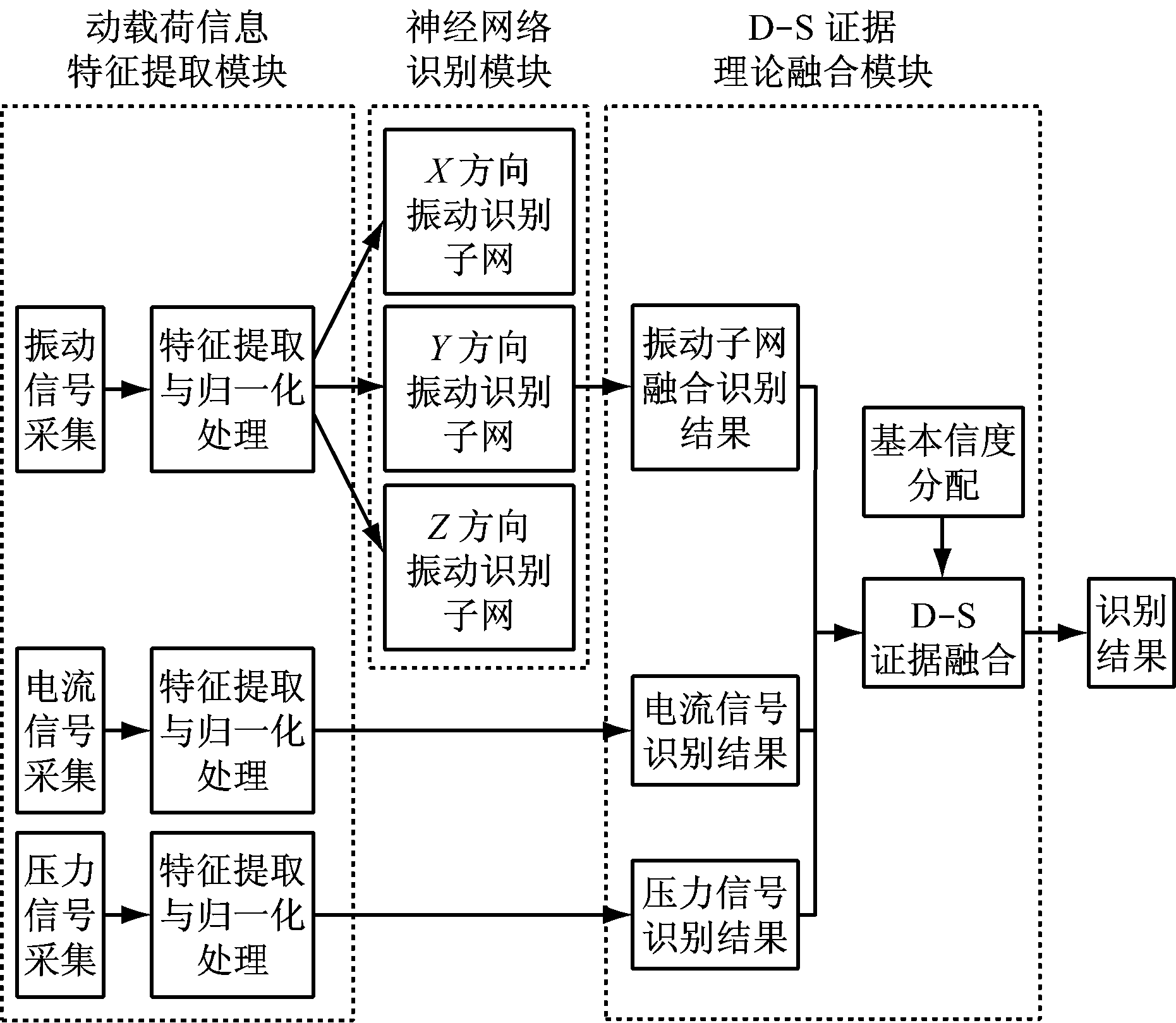 在得到工况的前提下,掘进机进行动载荷识别。基于多神经网络与证据理论相融合的掘进机动载荷识别方法网络结构包括动载荷信息特征提取模块、神经网络识别模块、D-S证据理论融合模块3个部分,如图2所示。
