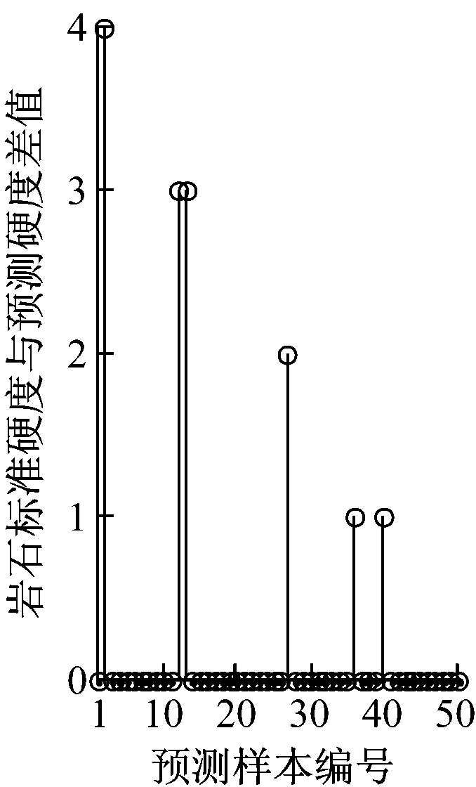 根据试验结果,对图2所示的掘进机动载荷识别网络结构进行简化。钻进过程中只保留Z方向振动识别子网,水平截割时保留Y方向振动识别子网,纵向截割时保留X方向振动识别子网。利用简化网络对不同岩石硬度等级的典型样本进行测试,结果如图8所示。图8(a)中,点表示标准的岩石硬度,三角形表示网络预测硬度;图8(b)中,圆圈表示标准岩石硬度和网络预测硬度的差值。可看出50组输出中只有6组输出发生错误,动载荷识别准确率达88%,识别准确率较高。