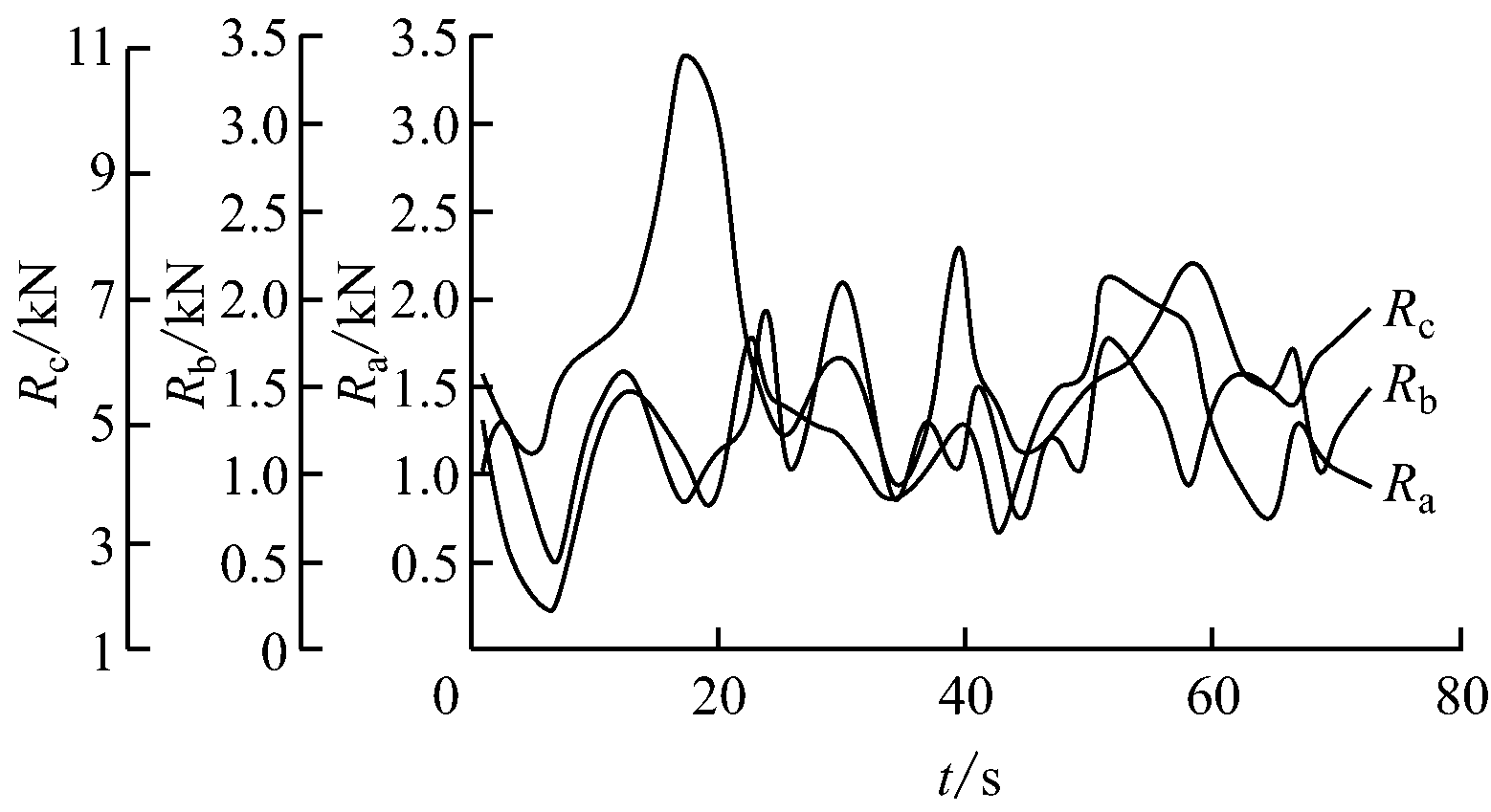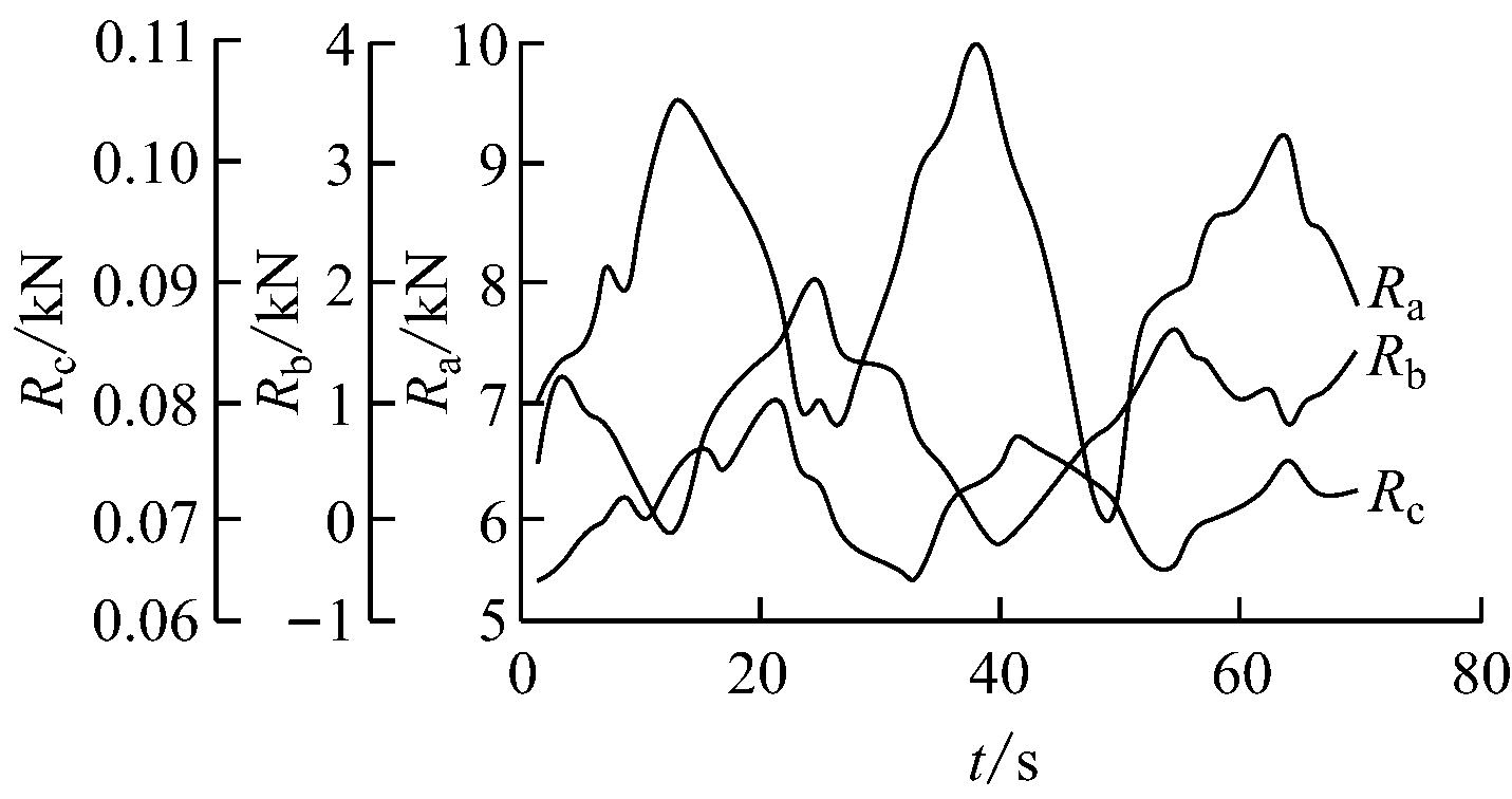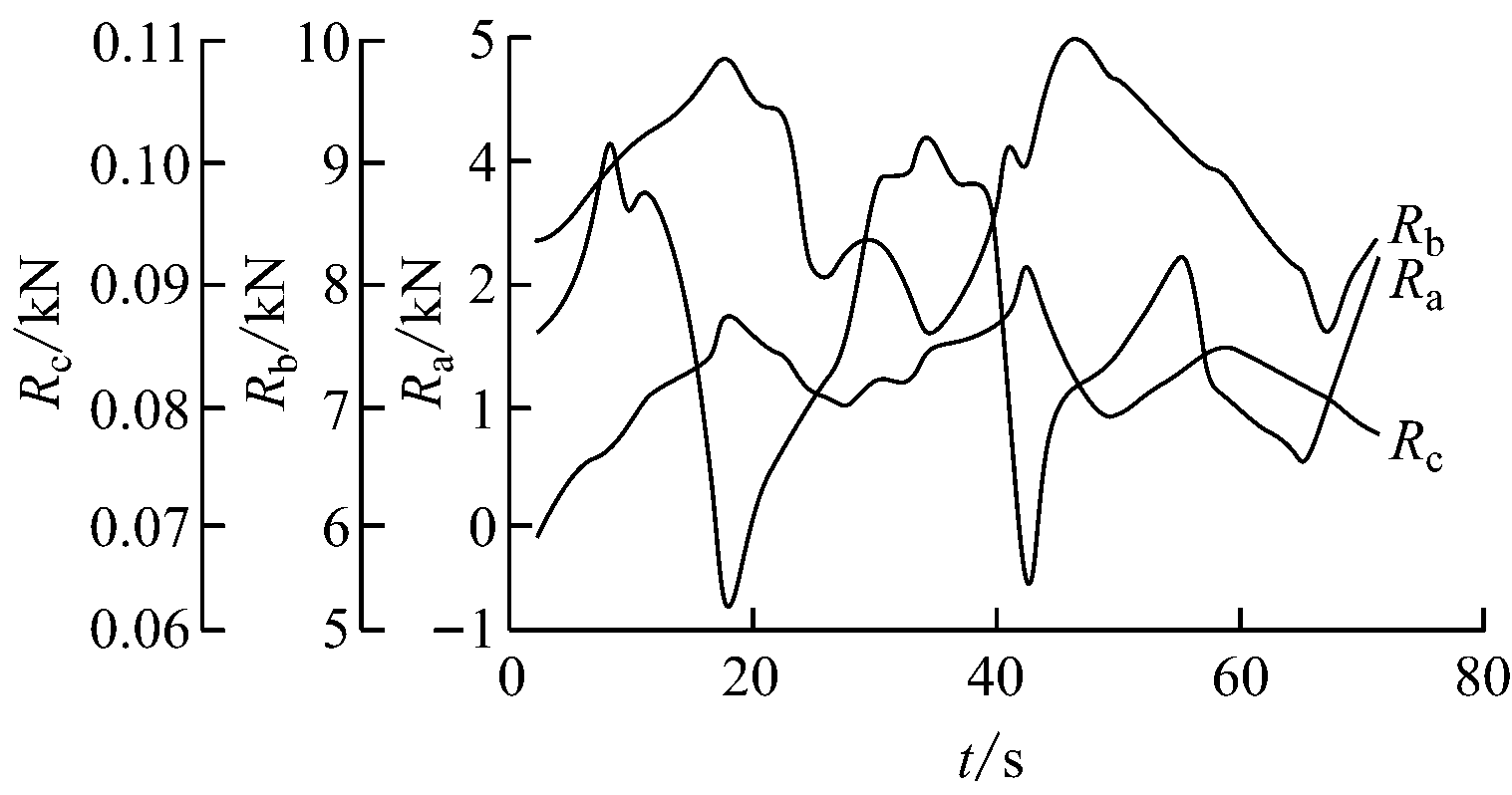 利用模拟程序,得到掘进机纵向钻进工况下截割头的载荷模拟曲线,如图5所示,其中t为时间,Ra为截割升力,Rb为横向阻力,Rc为钻进阻力。
