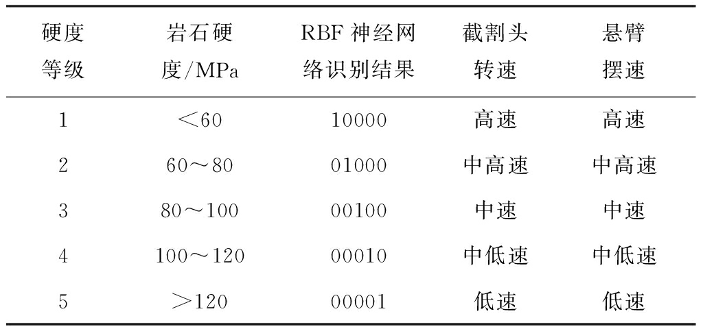 岩巷掘进机的截割对象是岩石,动载荷的大小代表岩石的硬度等级。掘进机动载荷识别方法将岩石硬度划为1,2,3,4,5级。设定以0与1组成的数字表示对应的硬度等级,即RBF神经网络输出层的节点数M=5。岩石硬度等级、悬臂摆速、截割头转速及RBF神经网络识别结果对照见表1。