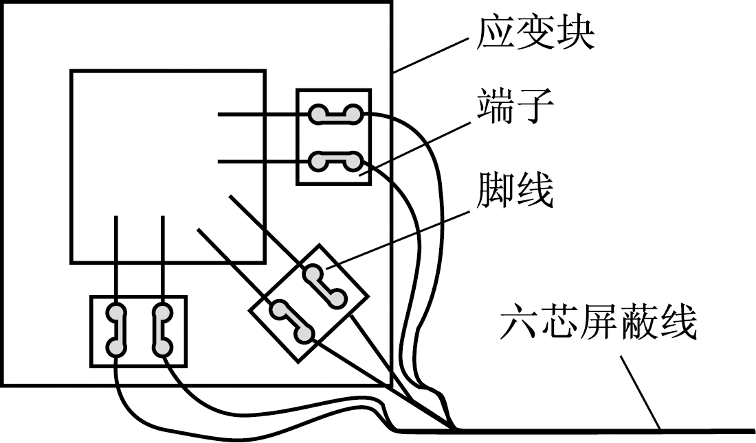 为了降低实验误差,应变砖和混凝土选用相同配比进行制作。应变砖的制作应在混凝土试样制作前1~2周内完成,以使其有足够的时间凝固。用502胶把应变花和端子粘到混凝土块的中部,然后用万用表检查应变花是否短路,用小功率的电焊把应变花引线焊接到端子上,焊接过程中要避免虚焊点的存在。应变砖如图2所示。