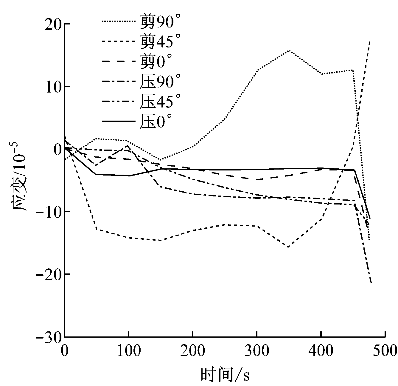 图4(f)、(g)、(h)分别为压90°、压45°、压0°测出来的应变,在整个加载过程中,图3(c)中的受压面向外扩增,故这3个应变片除在加载初期有正负波动外,其余加载过程测出的应变都为负值。剪0°、压90°、压0°测出的应变非常接近,这是因为这几个应变片测得的都是试样向外扩增应变。