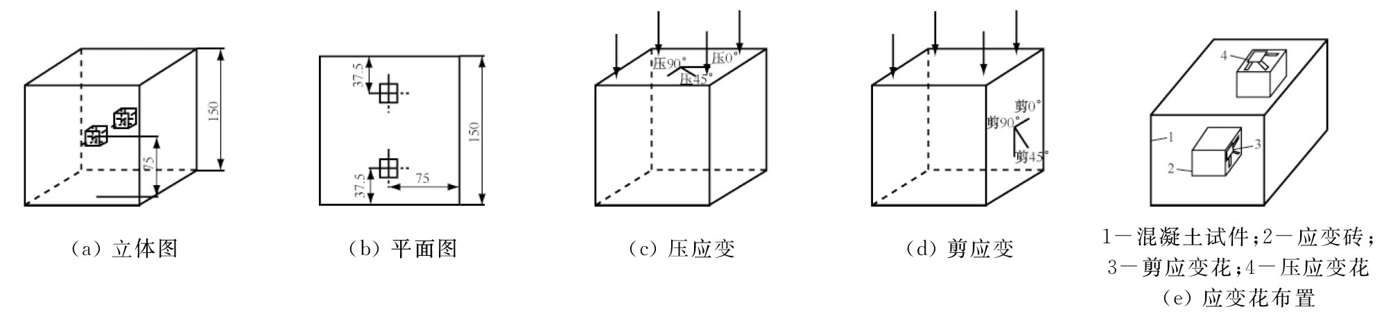 将应变砖埋在试样中间高度的平面上,在距其正中心左右37.5 mm各埋设一个应变砖,应变砖的布置如图3(a)、(b)所示。其中一个应变砖贴应变片的面与加载方向垂直,如图3(c)所示,用来测量压应变;另一个应变砖贴应变片的面与加载方向平行,如图3(d)所示,用来测量剪应变。应变花布置如图3(e)所示。