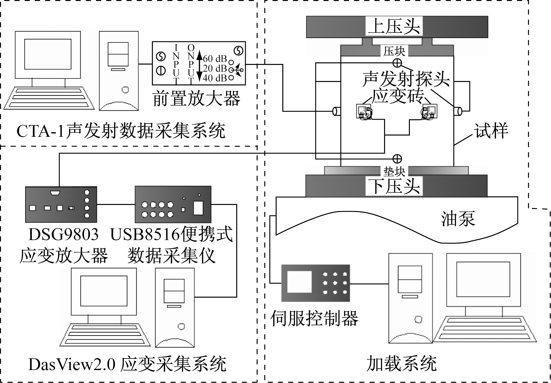 受载混凝土声发射响应和裂隙演化实验系统主要由加载系统、应变采集系统、声发射数据采集系统组成,如图1所示。加载系统采用微机控制电液伺服压力试验机,实验采用力控加载方式,加载速率为500 N/s。声发射信号的采集系统为24通道PCI-8(AEwin Rock Test for Express-8)型声发射数据采集系统。应变采集系统由应变片、USB8516便携式数据采集仪、DSG9803应变放大器和DasView2.0软件组成,能实现应变的实时动态采集。