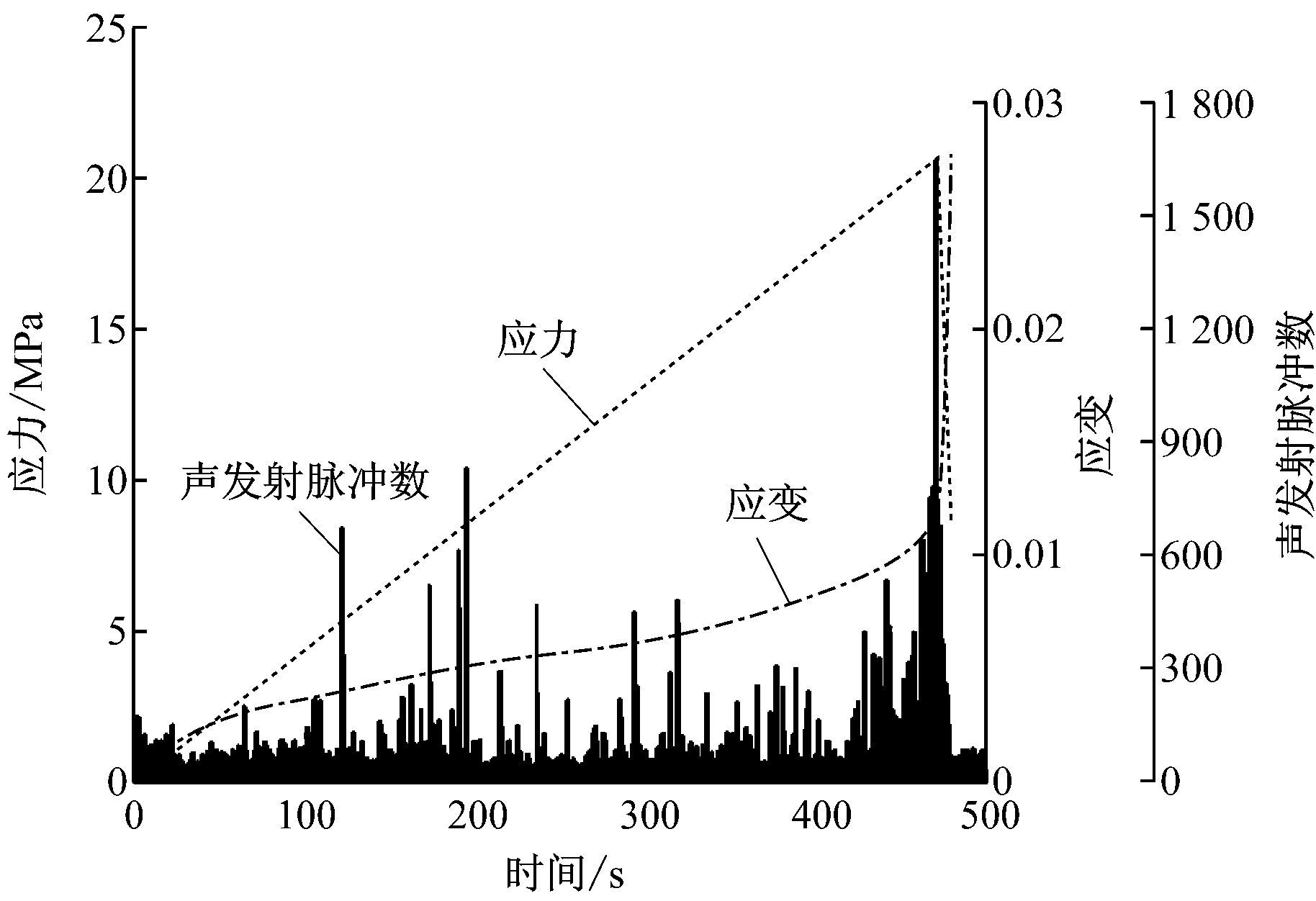 声发射(Acoustic Emission,AE)是当材料受外力或内力作用产生变形或断裂,以弹性波的形式向外释放应变能量的物理现象[6]。自20世纪50年代金属材料声发射的Kaiser效应被发现以来,声发射技术逐步被用于材料特性研究。Lavrov A[7]利用声发射技术和Kaiser 效应对混凝土损伤破坏过程进行了定性和定量描述;孙强等[8]通过对砂岩声发射信息的时间特性分析,研究了整个实验过程中的声发射信息规律;纪洪广等[9]对混凝土材料损伤的声发射进行了动态检测试验研究;张茹等[10]研究了峰值应力前声发射的平静期现象,并对其成因进行了解释;董毓利等[11]分析了混凝土受压全过程声发射特性,构建了其损伤本构模型;纪洪广[12]研究了混凝土材料声发射与应力—应变参量耦合关系,定量描述了混凝土的损伤过程。