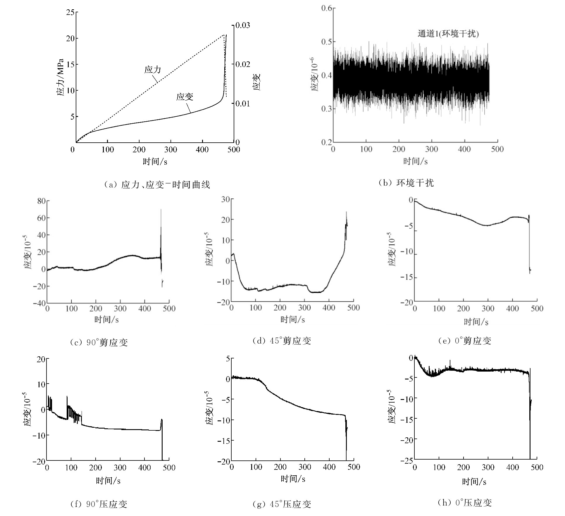 图4(a)为试样的轴向应力、应变随时间的变化曲线。轴向应变随时间变化可大致分为3个阶段:压密阶段,应变快速升高;线弹性阶段,应变缓慢升高;破坏阶段,应变瞬间升高。图4(b)为环境变化引起的应变,大约在0.4×10-6上下波动,与加载过程中引起的应变相比非常小,可以忽略不计。