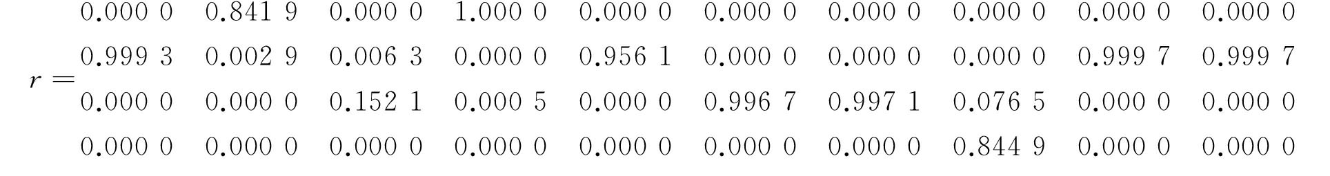 对于表3中所示数据,通过Matlab进行工作面瓦斯安全动态判别,基本步骤如下:① 原始数据预处理,使用premnmx()将数据规范化到[-1,1]区间。② 建立初始网格。③ 利用数据对网络进行训练。④ 对判别对象进行仿真识别:[Y,Pf,Af,E,perf]=sim(net,D,F,A,T),其中Y为网络输出;Pf为输入向量最终延迟条件;Af为网络层最终延迟条件;E为网络误差;perf为网络性能;net为使用的网络;D为判别对象;F为初始输入延迟条件,仅当输入有延迟时使用,默认为0;A为网络层初始延迟条件;T为网络标靶。