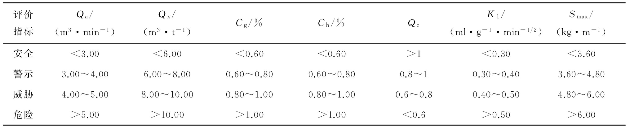 针对以上6种瓦斯安全判别指标,分别设置4种评判等级,即安全、警示、威胁和危险。对于瓦斯涌出量、瓦斯浓度和煤体瓦斯防突参数值等指标,按照国家高瓦斯矿井规定及安全监测的标准,结合80%和60%两个等级进行划分。工作面瓦斯抽采纯量需结合抽采设计来评价,用实际抽采纯量和设计抽采纯量的比值来衡量瓦斯抽采效果,当实际抽采纯量与设计抽采纯量大于或等于1时为安全状态,依次按照80%和60%来分级,各指标具体分级见表2。