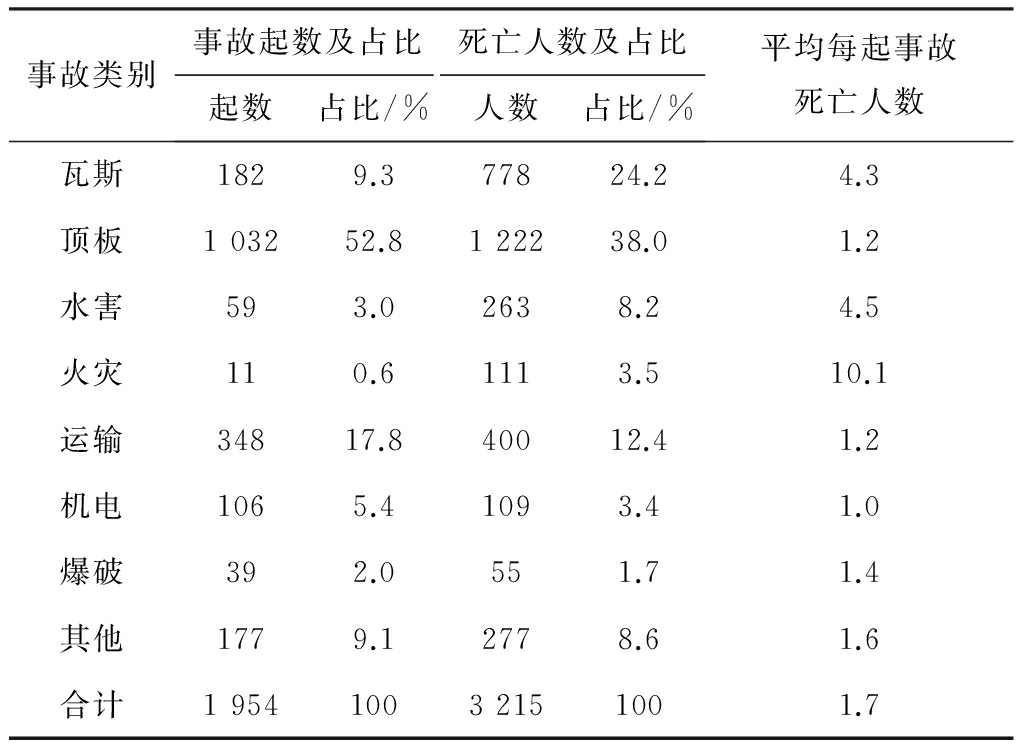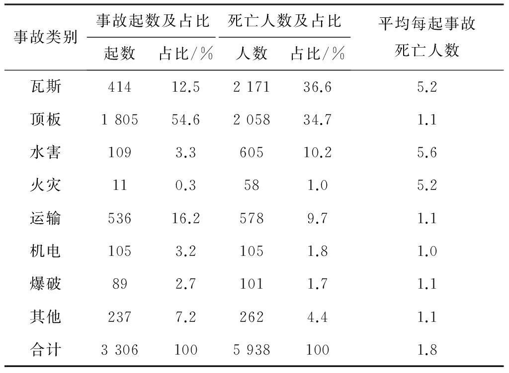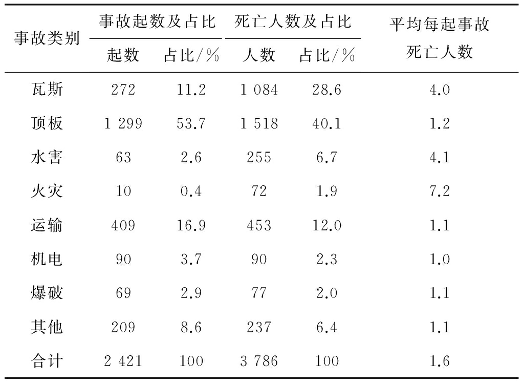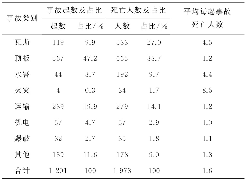 2011年,全国煤矿共发生死亡事故1 201起,死亡1 973人[1,9],平均每起事故死亡1.6人,其中顶板事故起数和死亡人数均最多,见表8。