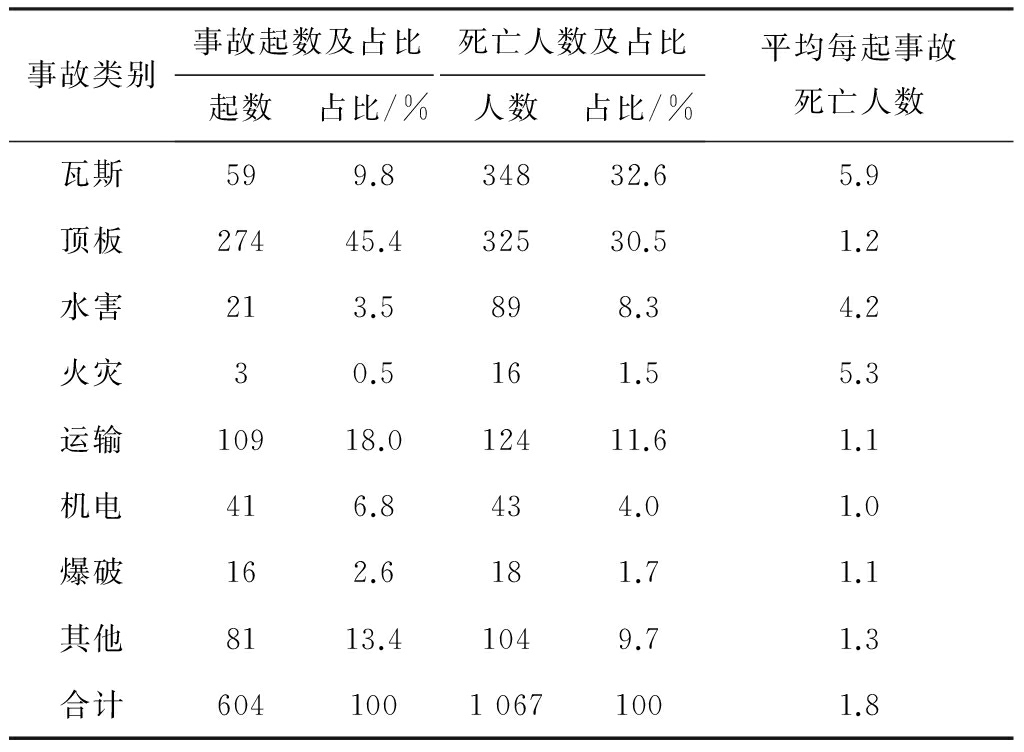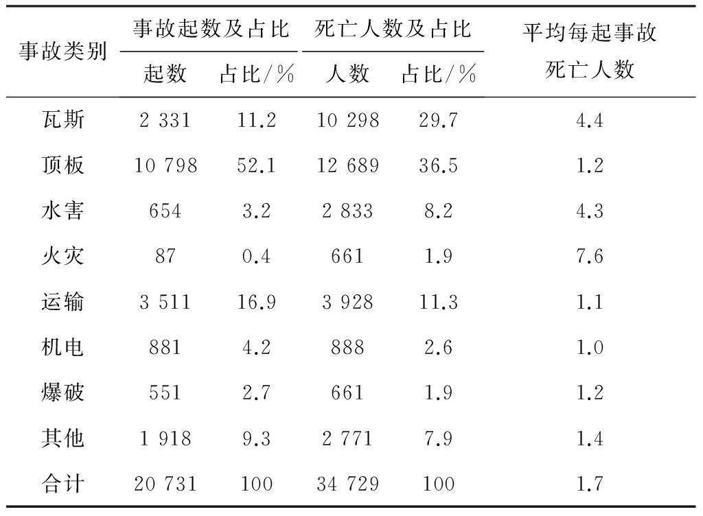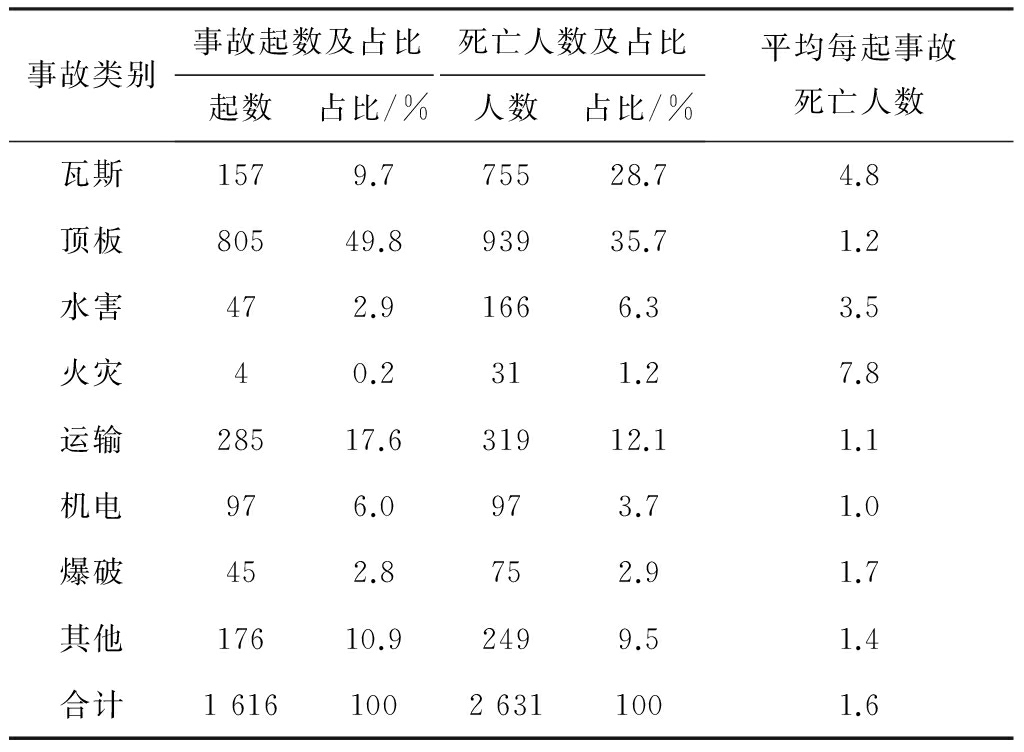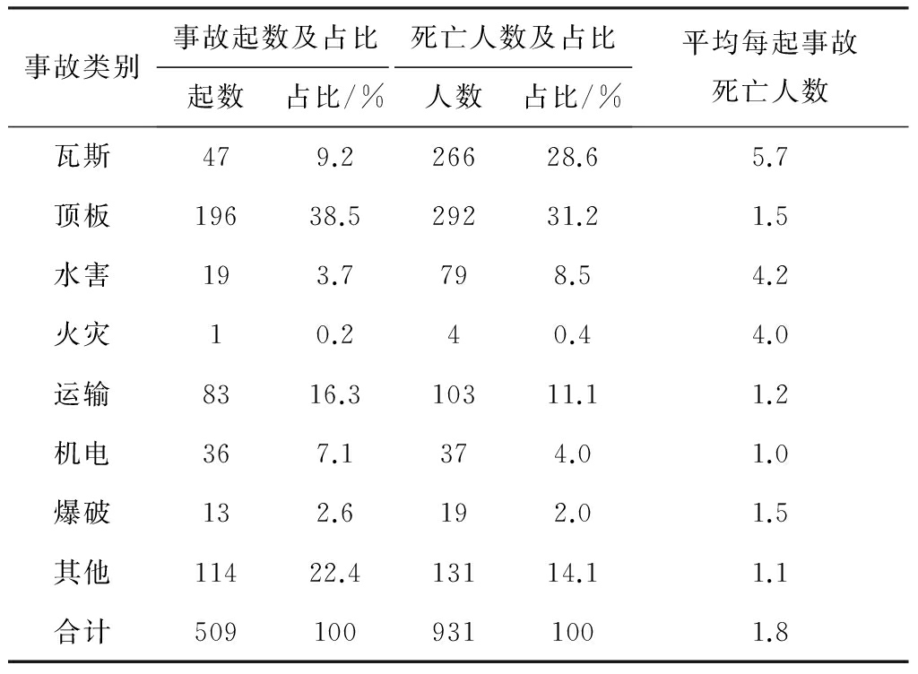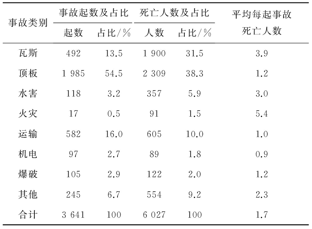 2011年,全国煤矿共发生死亡事故1 201起,死亡1 973人[1,9],平均每起事故死亡1.6人,其中顶板事故起数和死亡人数均最多,见表8。