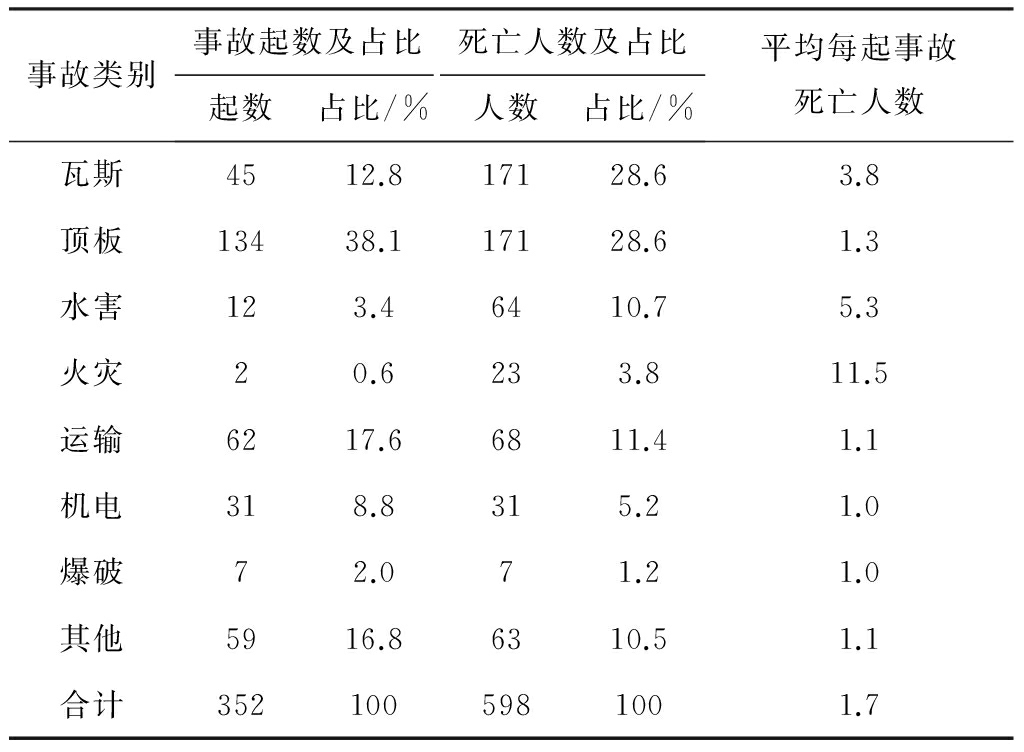 2015年,全国煤矿共发生死亡事故352起,死亡598人[1,13],平均每起事故死亡1.7人,其中顶板事故起数最多,顶板事故和瓦斯事故死亡人数并列第一,见表12。