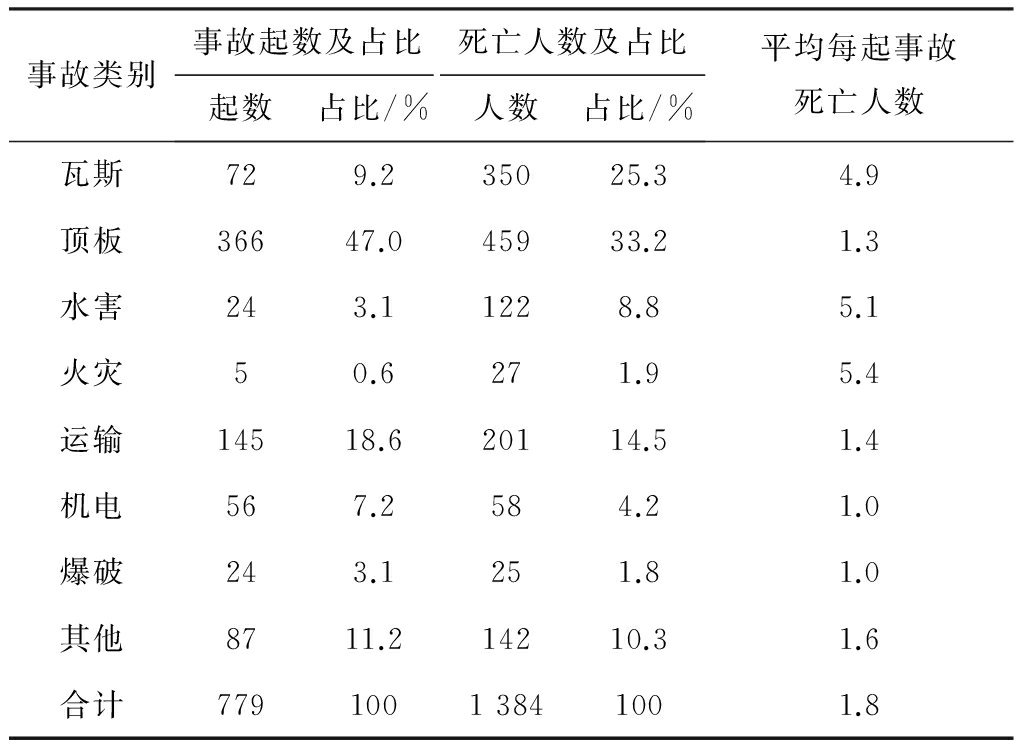 2012年,全国煤矿共发生死亡事故779起,死亡1 384人[1,10],平均每起事故死亡1.8人,其中顶板事故起数和死亡人数均最多,见表9。